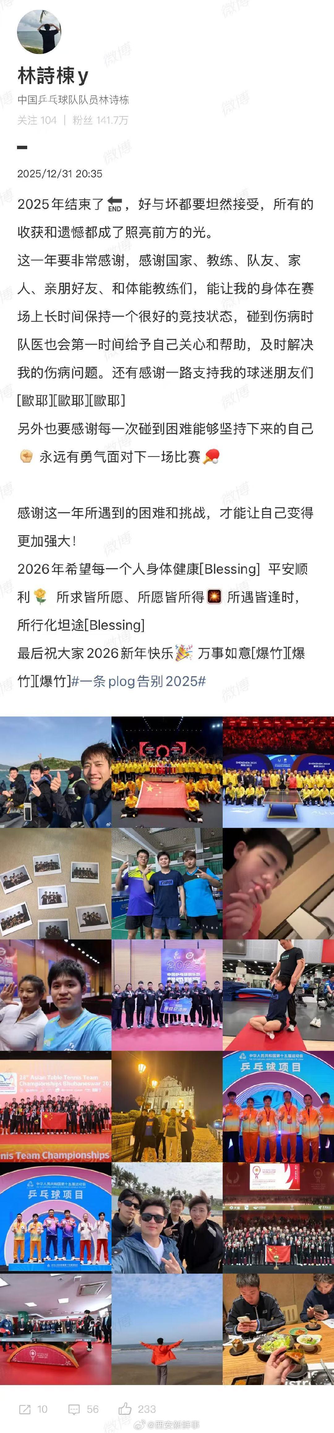【林诗栋说25年结束了好坏都接受】林诗栋发博总结2025年12月31日,发博总结2025年。他称,2025年结束了,好与坏都要坦然接受,所有的收获和遗憾都成了照亮前方的光。这一年要非常感谢,感谢国家、教练、队友、家人、亲朋好友、和体能教练们,还有感谢一路支持我的球迷朋友们。感谢这一年所遇到的困难和挑战,才能让自己变得更加强大。2026年希望每一个人身体健康、平安顺利、所求皆所愿、所愿皆所得、所遇皆逢时,所行化坦途,最后祝大家2026新年快乐🎉