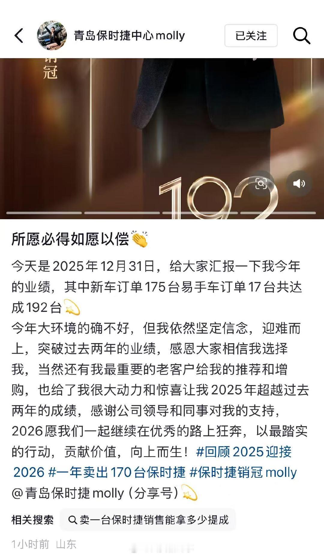 【青岛保时捷女销售晒2025年业绩】保时捷女销冠今年卖车192台超过去2年12月31日,青岛保时捷网红女销冠牟倩文在社交平台发文称,今天是2025年12月31日,给大家汇报一下我今年的业绩,其中新车订单175台易手车订单17台共达成192台。今年大环境的确不好,但我依然坚定信念,迎难而上,突破过去两年的业绩,感恩大家相信我选择我,当然还有我最重要的老客户给我的推荐和增购,也给了我很大动力和惊喜让我2025年超越过去两年的成绩,感谢公司领导和同事对我的支持,2026愿我们一起继续在优秀的路上狂奔,以最踏实的行动,贡献价值,向上而生!