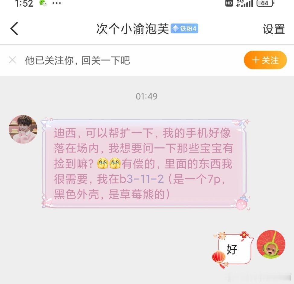 大家帮扩一下,今天贵阳场演唱会这位yuni的手机好像落在场内了,想要问一下有宝宝捡到嘛?有偿的,里面的东西对她很重要,她在b3-11-2(是一个7p,黑色外壳,是草莓熊的)