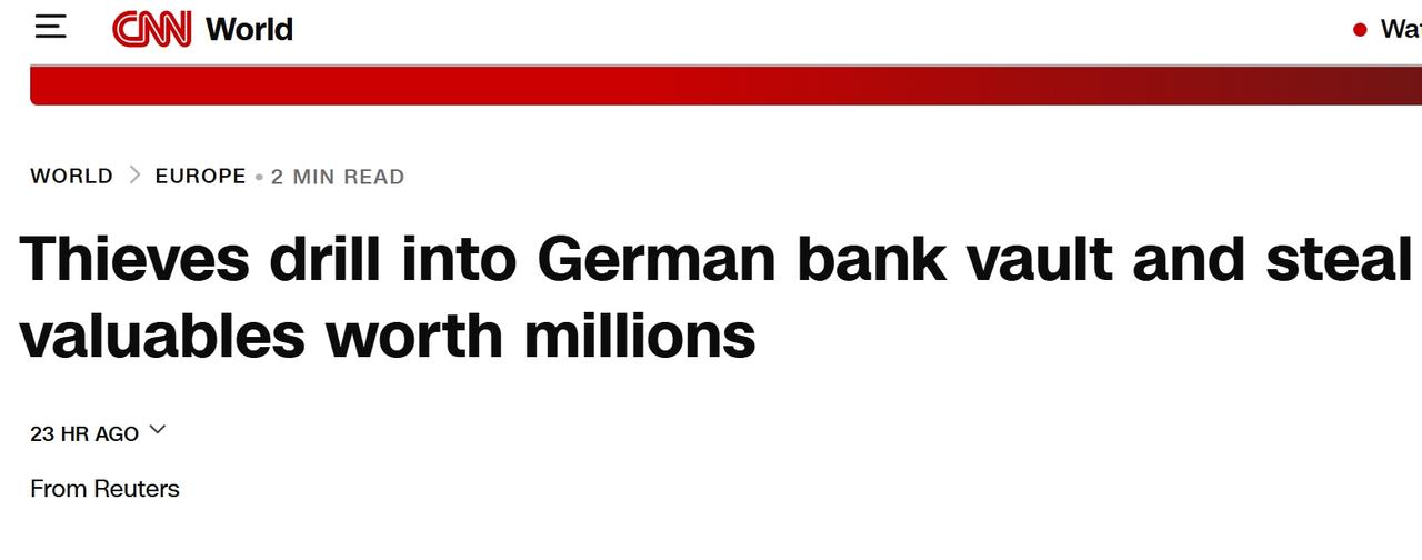 德国银行金库被盗,损失上千万欧元 当地时间周二,德国警方表示,窃贼利用圣诞节的安静期钻入一家德国零售银行的保险库,偷走了至少1000万欧元的现金和客户保险箱中的贵重物品。 警方在声明中称,犯罪分子在西部城市盖尔森基兴的Sparkasse银行一家分行钻穿了厚厚的混凝土墙,随后打破数千个保险箱,盗取了估计数百万欧元的金额。 由于德国大多数商店和银行在圣诞期间从12月24日晚就开始关闭,警方直到12月29日星期一凌晨火警响起后才发现这个洞。 周二,数十名愤怒的顾客聚集在银行前,高喊“让我们进去!”。 “我昨晚没睡着。“我们没有收到任何信息,”一名男子在分行外等待时告诉《世界报》广播员,他补充说他已经使用这个保险箱25年了,里面装着他为养老而存的储蓄。 另一名男子说,他用自己的保险箱为家人存放现金和珠宝。 盖尔森基兴Sparkasse银行发言人尚未对此发表评论。 警方目前还没有窃贼的线索。