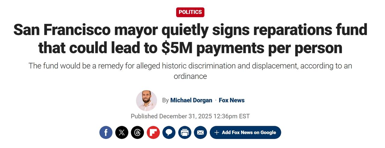黑命贵:美国旧金山黑人有可能获得500万美元赔偿金 美国加州旧金山市长丹尼尔·卢里签署了一项条例,设立了“赔偿基金”,未来可能向每位符合条件的黑人居民提供最高500万美元的赔偿,以应对涉嫌的历史歧视和流离失所。 该条例于本月早些时候由监督委员会通过,民主党市长丹尼尔·卢里于圣诞节前两天签署。它为基金建立了法律框架,该基金可通过私人捐款、基金会及其他非市政府来源融资。 条例部分内容是:“赔偿计划列出了多种方法,以向在旧金山遭受确证伤害的黑人和/或奴隶后代的个人提供赔偿、赔偿和康复。” 该条例特别引用了旧金山非裔美国人赔偿咨询委员会(AARAC)于2023年发布的政策报告和建议文件,AARAC是一个由市政府任命的咨询委员会。 该报告具有约束性,研究了对黑人居民的伤害并提出了补救方案,包括建议支付500万美元。根据美国人口普查数据,旧金山约有46,000名黑人居民。 报告在执行摘要中指出:“旧金山市和县及其相关机构应为过去的伤害正式道歉,并承诺在黑人社区进行大量持续、系统性和项目性的投资,以应对历史上的伤害。” 该提案“规定,市政府将一次性支付给每位符合条件的人500万美元。” 报告还建议设立与地区中位收入挂钩的保证年收入,并设立包括赔偿办公室在内的新市政机构来管理项目。它还呼吁实施重大住房干预措施,如租金援助、住房支持和市政府支持的基金,用于在黑人商业走廊沿线购买房产,同时投资数百万美元的黑人企业。
