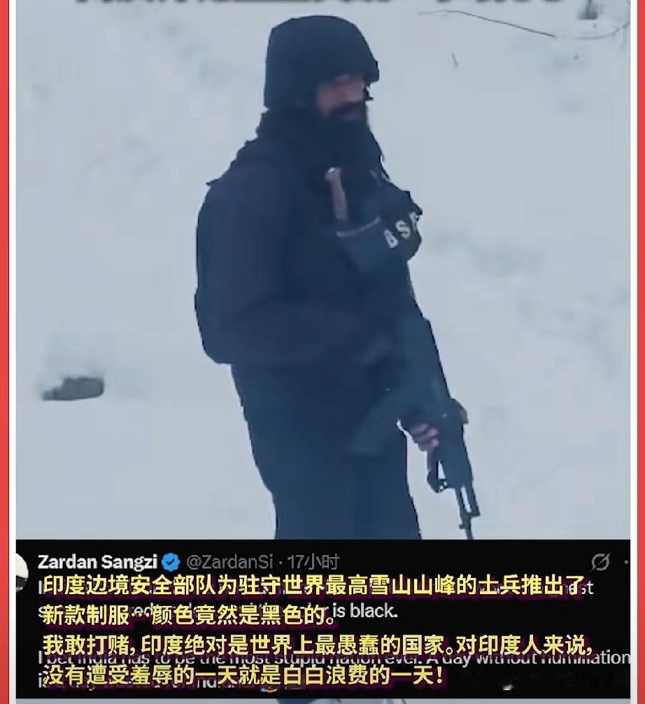 一瞄一个准? 在高原雪地的一抹黑色幽默... 印度新作战服好惊艳... 白天生怕瞄不准,夜间一个照明弹连热成像都省了..也许是为了在走丢救援的时候,比较好找吧... 黑白分明体现出三哥的聪明和胆气,加大了舍我其谁的存在感... 有首歌怎么唱来着:哦,对,白天不懂印的黑...