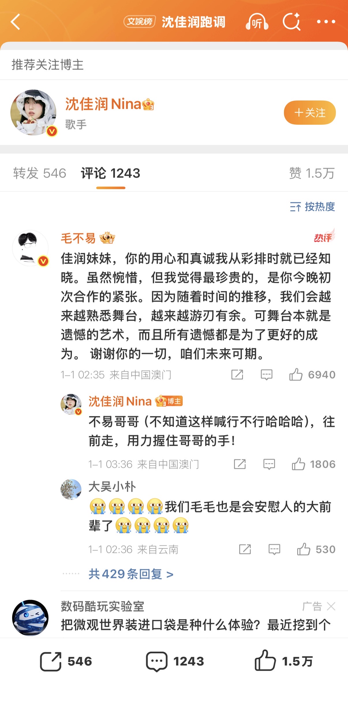 2026年第一暖,是毛不易给的。沈佳润在跨年跟他合唱《不染》跑调,毛毛自己还没分到几句词,引发网友“我们没有惯着星二代的义务”“心疼毛不易”的评价。事后沈佳润给毛不易公开道歉,毛毛一句“舞台本就是遗憾的艺术”帮妹妹解围,很得体很真诚。