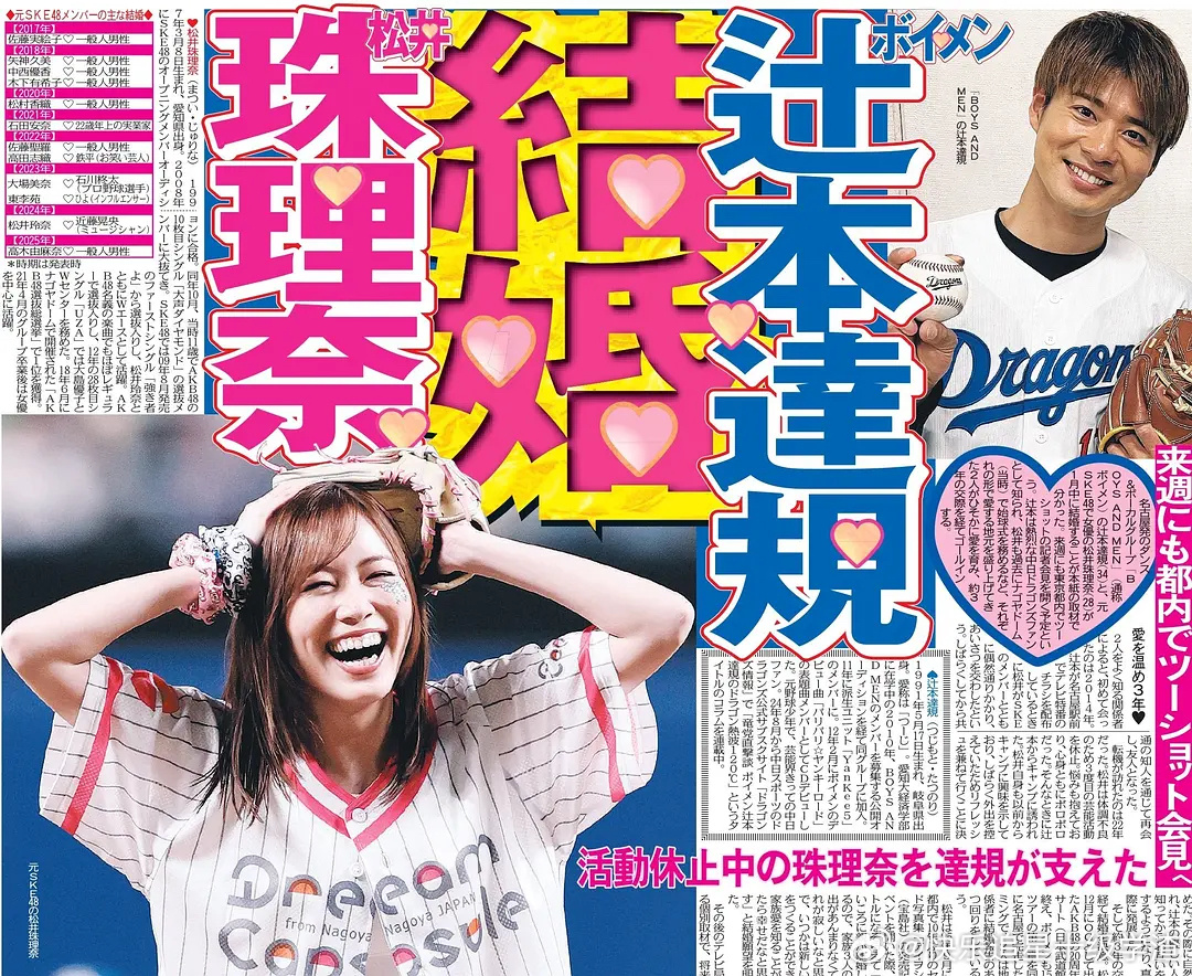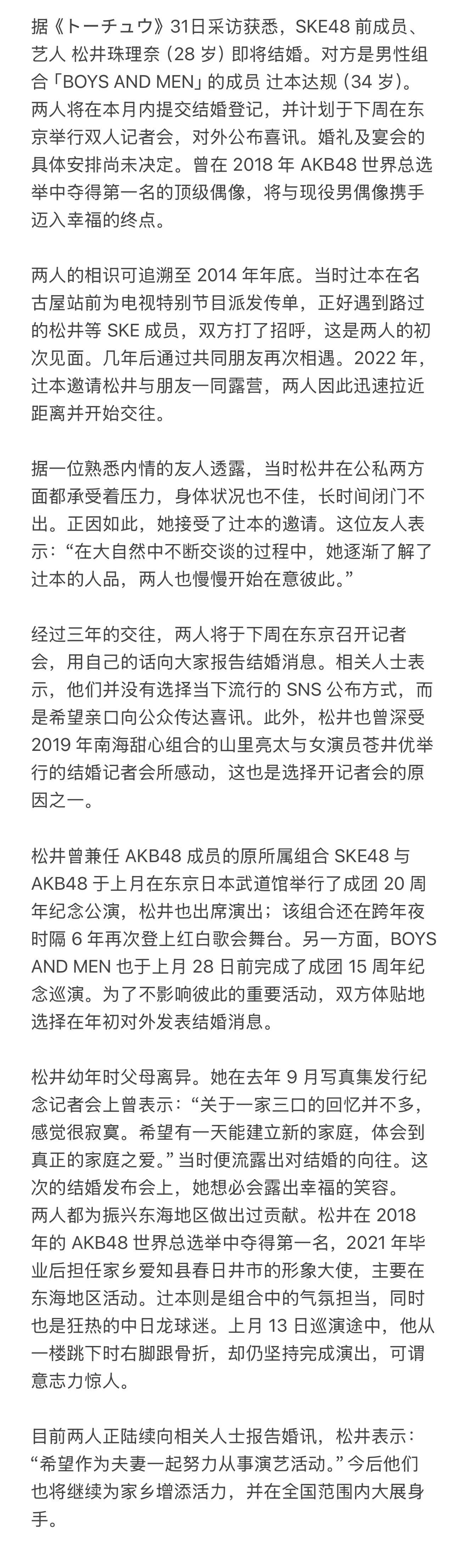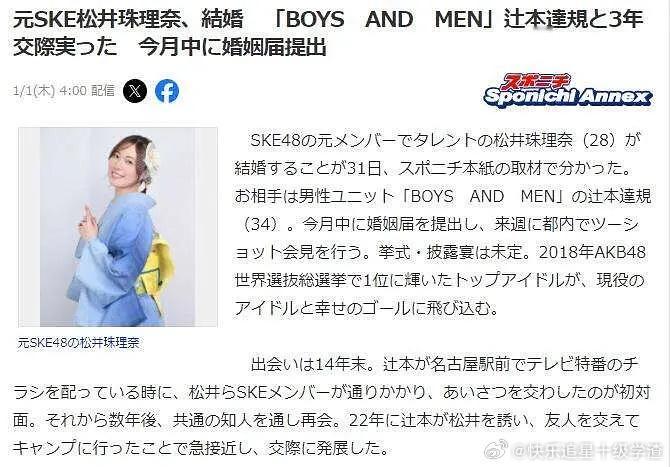 妈呀 一睁眼松井珠理奈要结婚了 对方是男性组合「BOYS AND MEN」的成员辻本达规(34 岁)