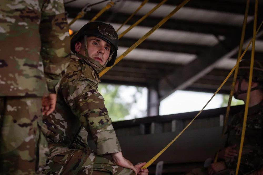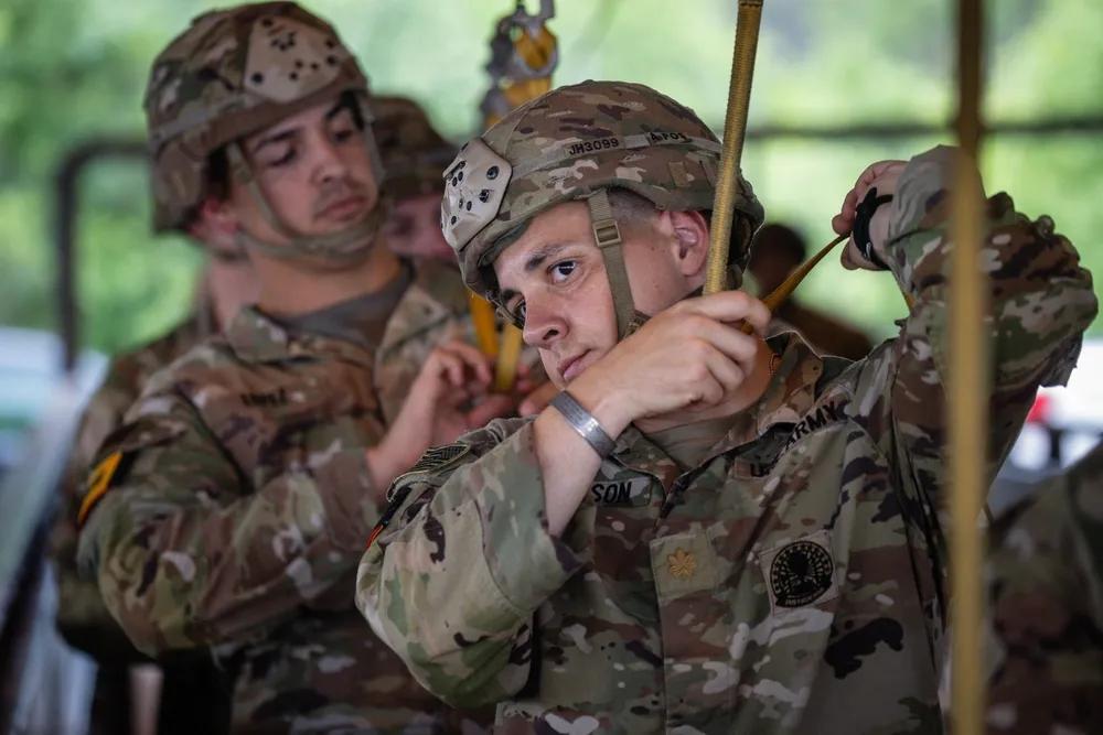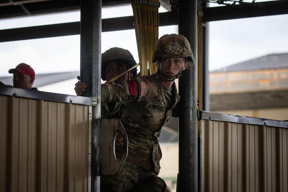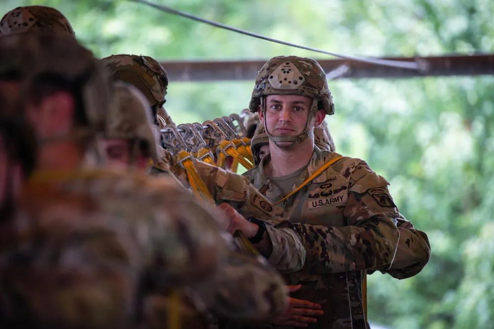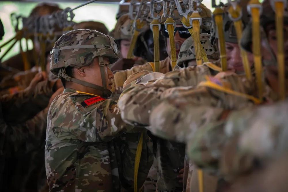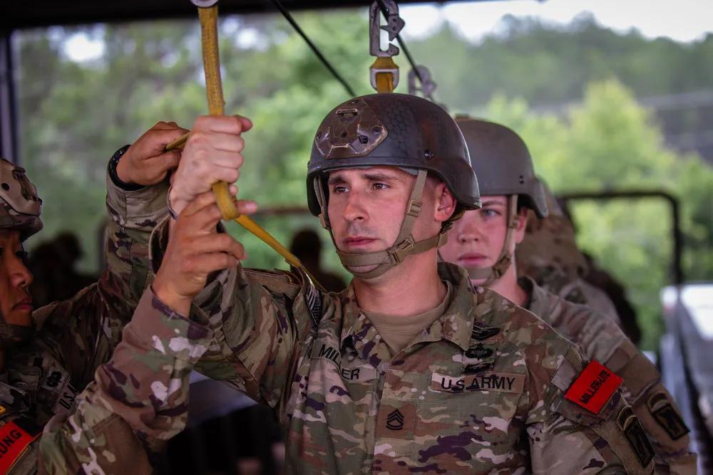 2025年5月29日,美军第十八空降军团的美国陆军跳伞长,在北卡罗来纳州布拉格堡为伞兵在空降行动前下达跳伞前指令,安全保障措施。语音的精准在空中作战的安全和执行中起着关键作用。在空降跳伞前,在静止绳程序中检查伞兵的静态防线。检查确保每位伞兵的装备安全且准备安全撤离。