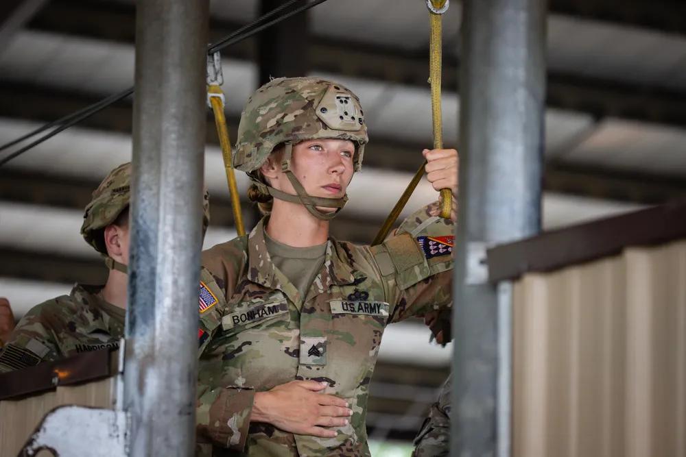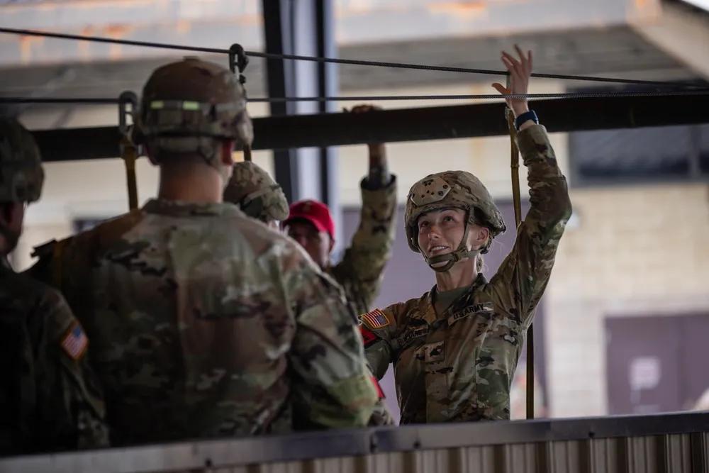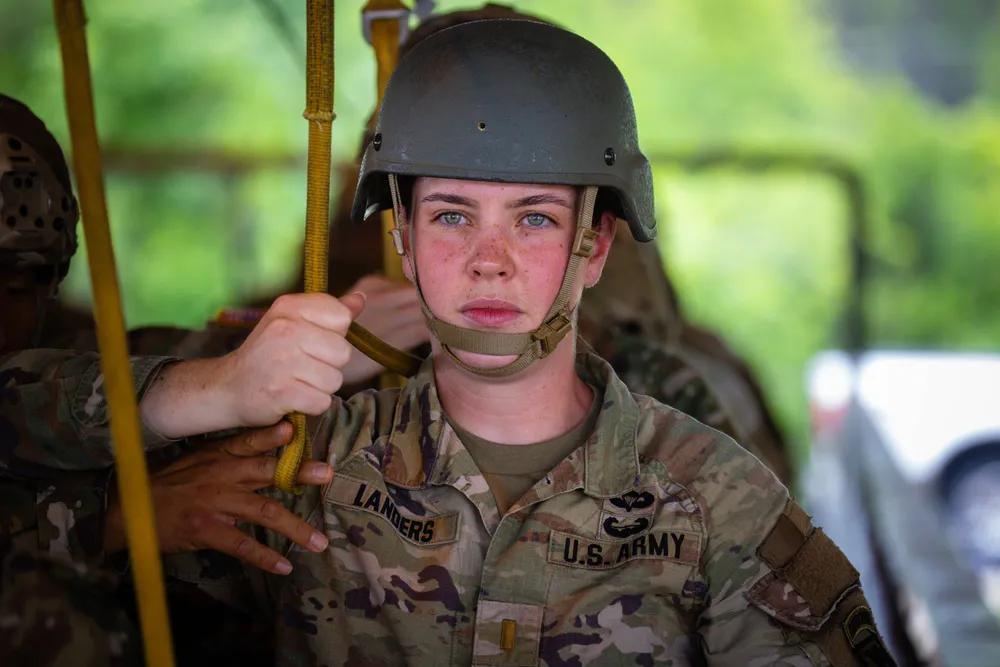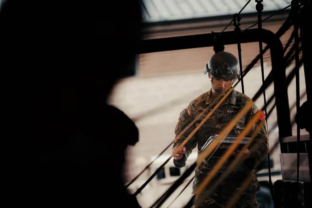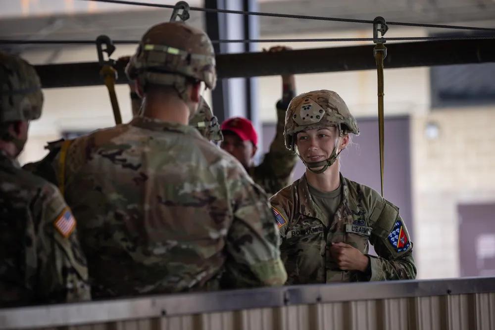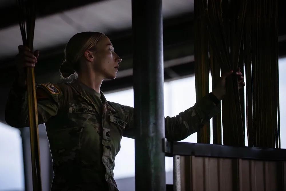 2025年5月29日,美军第十八空降军团的美国陆军跳伞长,在北卡罗来纳州布拉格堡为伞兵在空降行动前下达跳伞前指令,安全保障措施。语音的精准在空中作战的安全和执行中起着关键作用。在空降跳伞前,在静止绳程序中检查伞兵的静态防线。检查确保每位伞兵的装备安全且准备安全撤离。