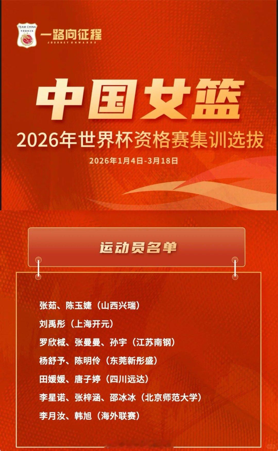 中国女篮公布15人集训名单 韩旭、李月汝入选,李梦、王思雨、杨力维、黄思静均未入选,中国女篮世界杯预选赛集训选拔名单公布:时间:1月4日-3月18日地点:北京体育大学名单:张茹、陈玉婕、刘禹彤、罗欣棫、张曼曼、孙宇、杨舒予、陈明伶、田媛媛、唐子婷、李星诺、张梓涵、邵冰冰、韩旭、李月汝安排:2月上旬和3月初在国内安排国际系列热身赛备战