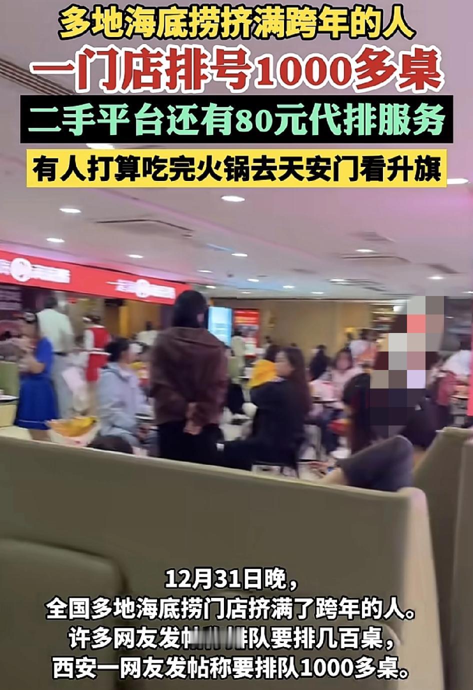全国海底捞跨年夜人流量爆满,有的门店排队超过1000桌,从10点开始排队,很有可能要轮到半夜有。西安的海底捞门店甚至在二手平台出现了带排队的服务,每桌80元,有网友称,在海底捞过夜。跨年是一个很不错的选择,毕竟是假期也是跨入新的一年,最开始的时刻,在海底捞消费性价比较高,可以过夜,可以打69折。
