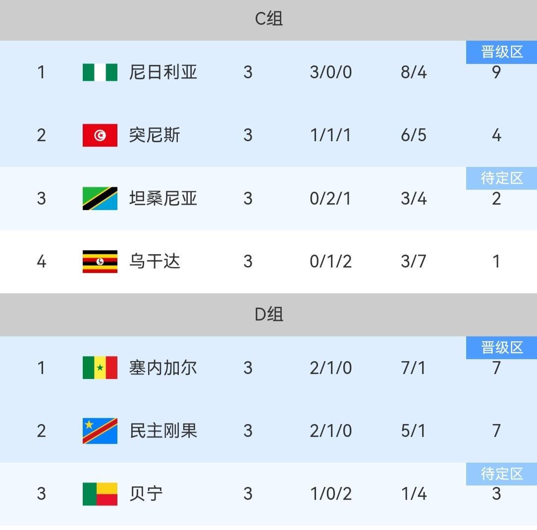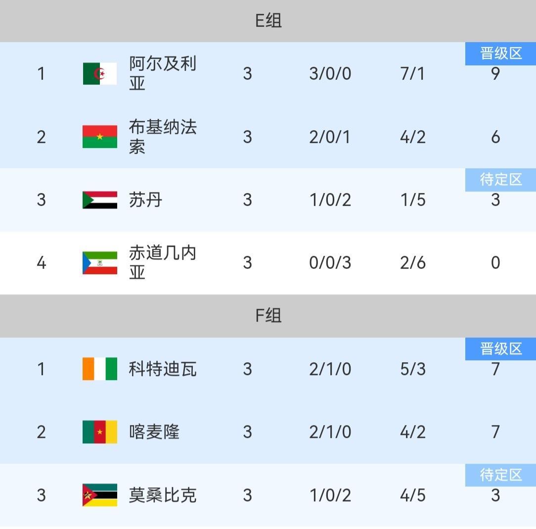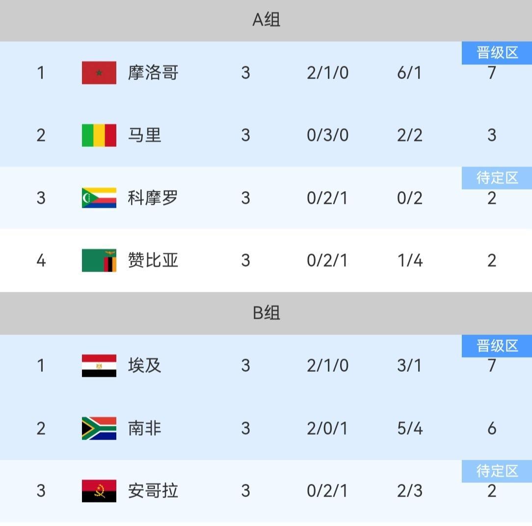 非洲杯小组赛 随着科特迪瓦让二追三击败加蓬、喀麦隆逆转莫桑比克,非洲杯第三轮的比赛全部结束,来看具体赛果和晋级淘汰赛的16支球队! A组摩洛哥一枝独秀,马里三连平以小组第二晋级,科摩罗和赞比亚同积两分被淘汰出局! B组埃及和南非排名前二晋级,安哥拉和津巴布韦无缘淘汰赛! C组尼日利亚三连胜强势晋级,突尼斯和坦桑比亚排名第二、第三晋级,乌干达出局! D组塞内加尔、民主刚果、贝宁三队携手晋级,博茨瓦纳三连败排名垫底! E组阿尔及利亚、布基纳法索以及苏丹晋级,赤道几内亚排名倒数第一! F组科特迪瓦、喀麦隆、莫桑比克携手闯进淘汰赛,奥巴梅扬所在的加蓬三战全败遗憾出局! 至此非洲杯淘汰赛的16支球队全部落位,上半区有突尼斯、塞内加尔、埃及、以及科特迪瓦,下半区则有阿尔及利亚、尼日利亚、喀麦隆和东道主摩洛哥,首场淘汰赛将在1月4号开战!