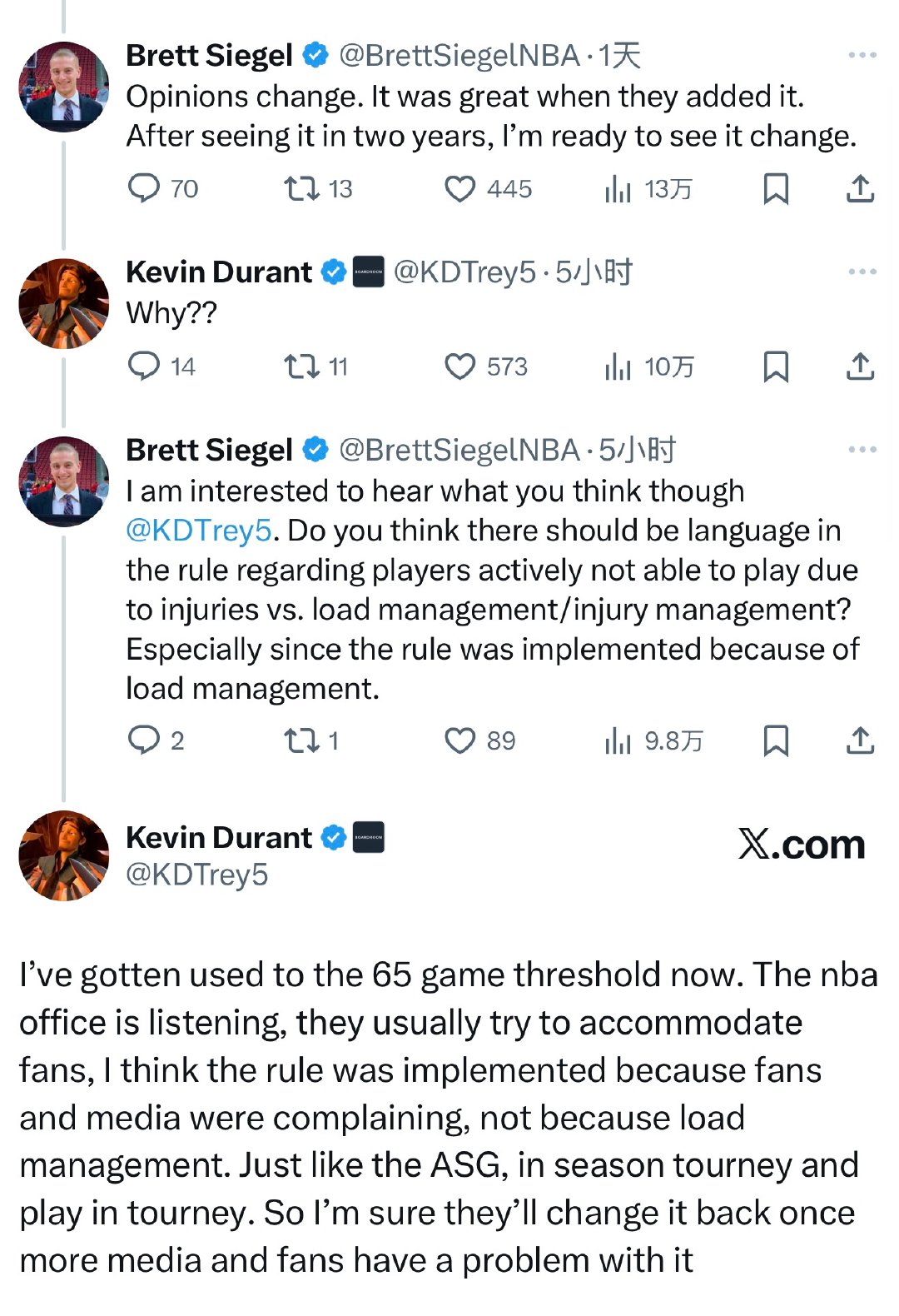 Brett Siegel:“是时候重新调整NBA奖项评选的最低出场场次限制了。”杜兰特评论:“为什么?”Brett Siegel:“我也很想听听杜兰特你的看法,你觉得这条规则里,是否应该对因真实伤病无法出战的球员,和轮休/伤病管理进行区分说明?尤其是考虑到,这项规则本来就是因为轮休问题才被推出的。”杜兰特回复:“我现在已经习惯了65场比赛这个门槛。NBA办公室其实是在听取意见的,他们通常会尽量照顾球迷。我觉得这条规则的出台,是因为球迷和媒体在抱怨,而不是因为所谓的轮休管理。就像全明星赛、季中锦标赛和附加赛一样。所以我敢肯定,一旦有更多媒体和球迷对这条规则产生不满,他们最终还是会把它改回去。”篮球年末狂欢季 休斯顿火箭