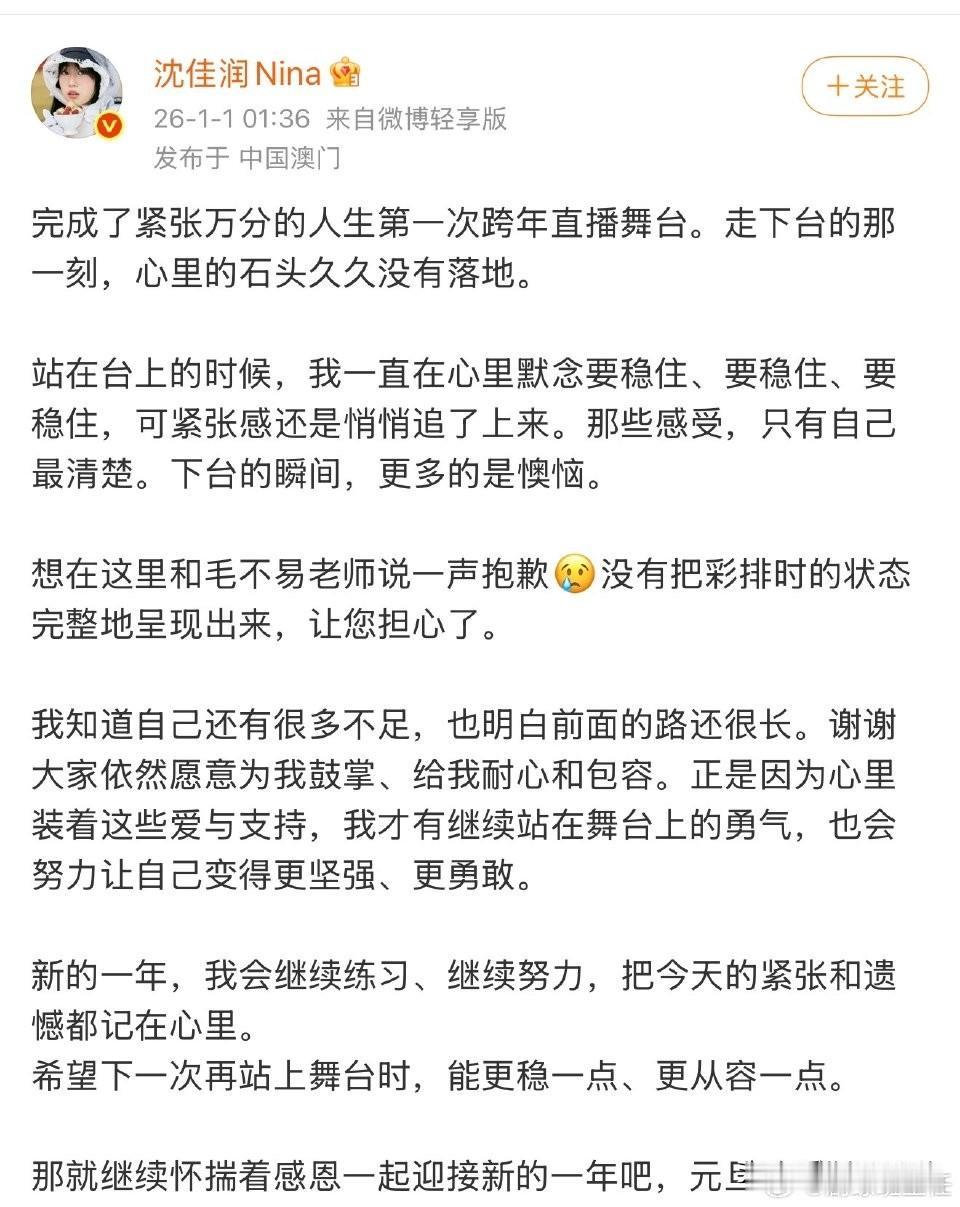 小沈阳这下是真的欠毛不易一个大人情了 因为他女儿跨年和毛不易合唱跑调 毛不易不仅台上鼓励事后还帮忙发文解围。 昨天跨年小沈阳女儿沈佳润和毛不易合唱《不染》,一开口就抢拍,后面的声音也很抖,还跑调。 网友都说沈佳润毁了这首歌,毛不易太难了,被沈佳润拖累。 沈佳润立马发文和毛不易道歉,承认自己的不足。 毛不易不仅回应了沈佳润的道歉,还贴心的为她解释,说彩排时见证了妹妹的用心和真诚,是因为妹妹经验不足太紧张所以没发挥好,还说“舞台本就是遗憾的艺术”。 毛不易情商太高了!短短几句话就从合作者的角度肯定了沈佳润彩排时表现出的能力,从前辈的角度说明了沈佳润翻车是因为紧张,从哥哥的角度宽慰了妹妹遗憾也是艺术的一部分。小沈阳 沈佳润