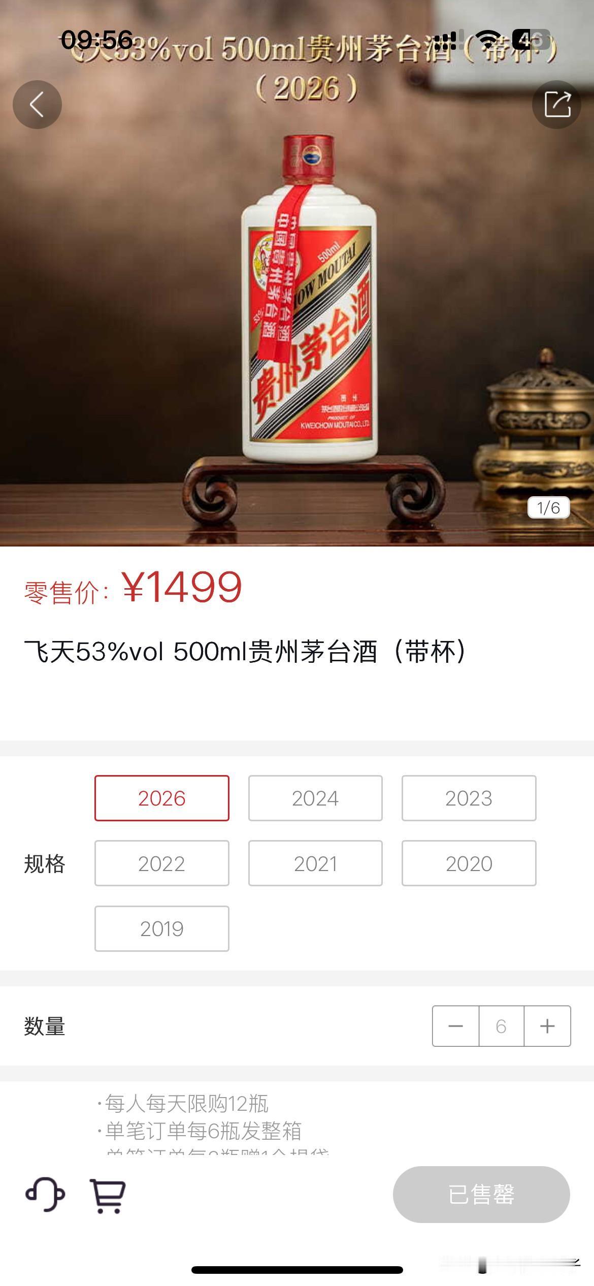 飞天茅台1499元一瓶,你抢到了吗? 茅台I茅台平台从今天开始上线1499元一瓶的2026年飞天茅台。 你抢到了吗?9点开抢,我9点半的时候就打开小程序,显示供货不足,9点50的时候再打开,就显示已经售罄了。 这里有个毛病,就是不能单瓶买,只能6瓶和12瓶买,也就是一箱一箱买。 这好像也不是友好的表示?