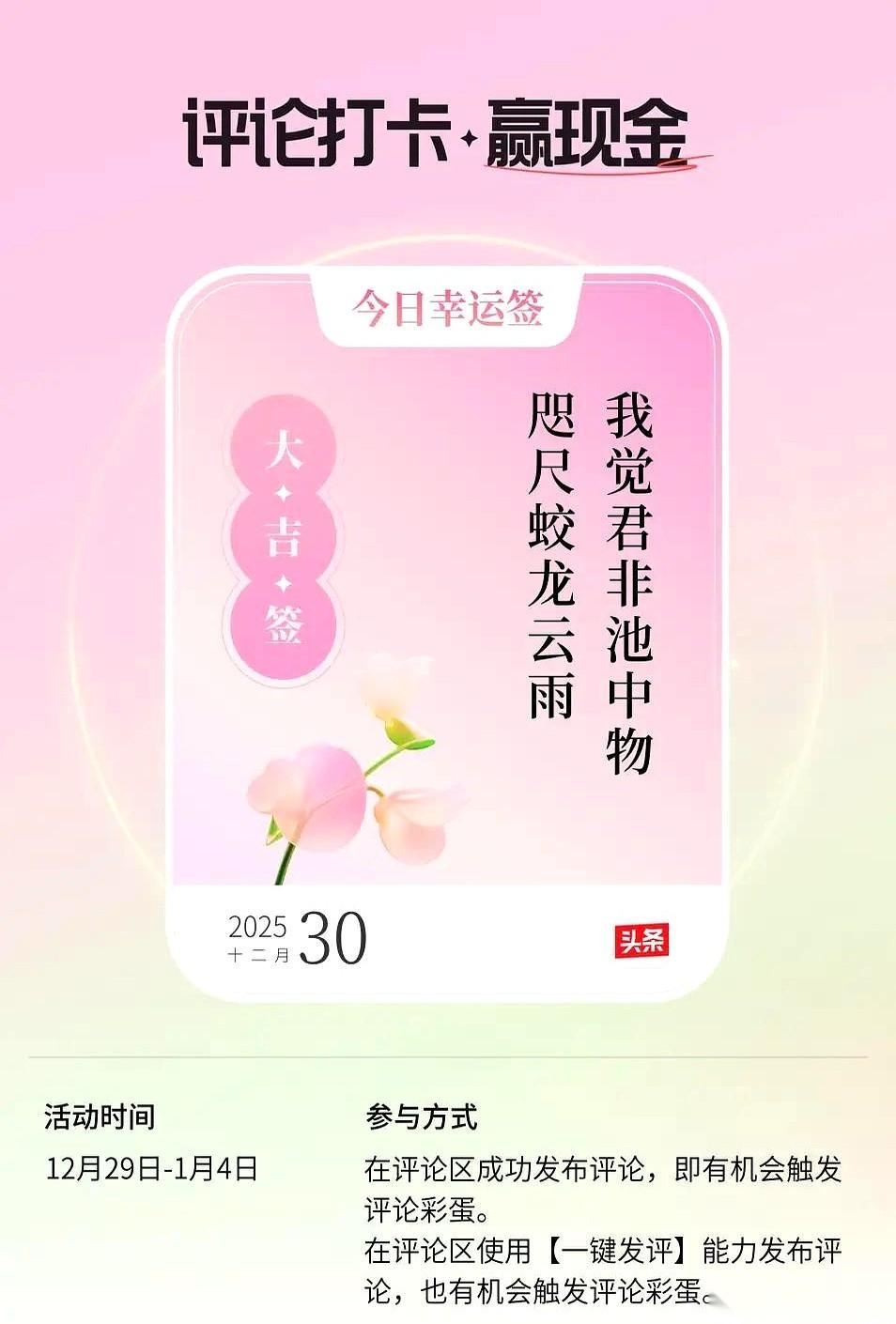 就因为随手打了一句评论,手机屏幕突然跳出一个【瓜分现金】的弹窗,我正要端起来的水杯都跟着晃了一下。 当时人还有点懵,以为是什么广告。 深夜刷手机,本来都准备睡了,看到个有意思的内容就顺手留了句言。刚放下手机,屏幕自己又亮了,一个金色的【每日运势签】从顶上飘下来,下面就挂着那个现金入口。 我点进去才看明白,原来是评论区的隐藏彩蛋。 这东西藏得也太深了,要不是无意中触发,估计永远都发现不了。 所以说,有时候最大的惊喜,就藏在最不起眼的随手一点里。你们也试试,看看是不是人人都有这个运气?