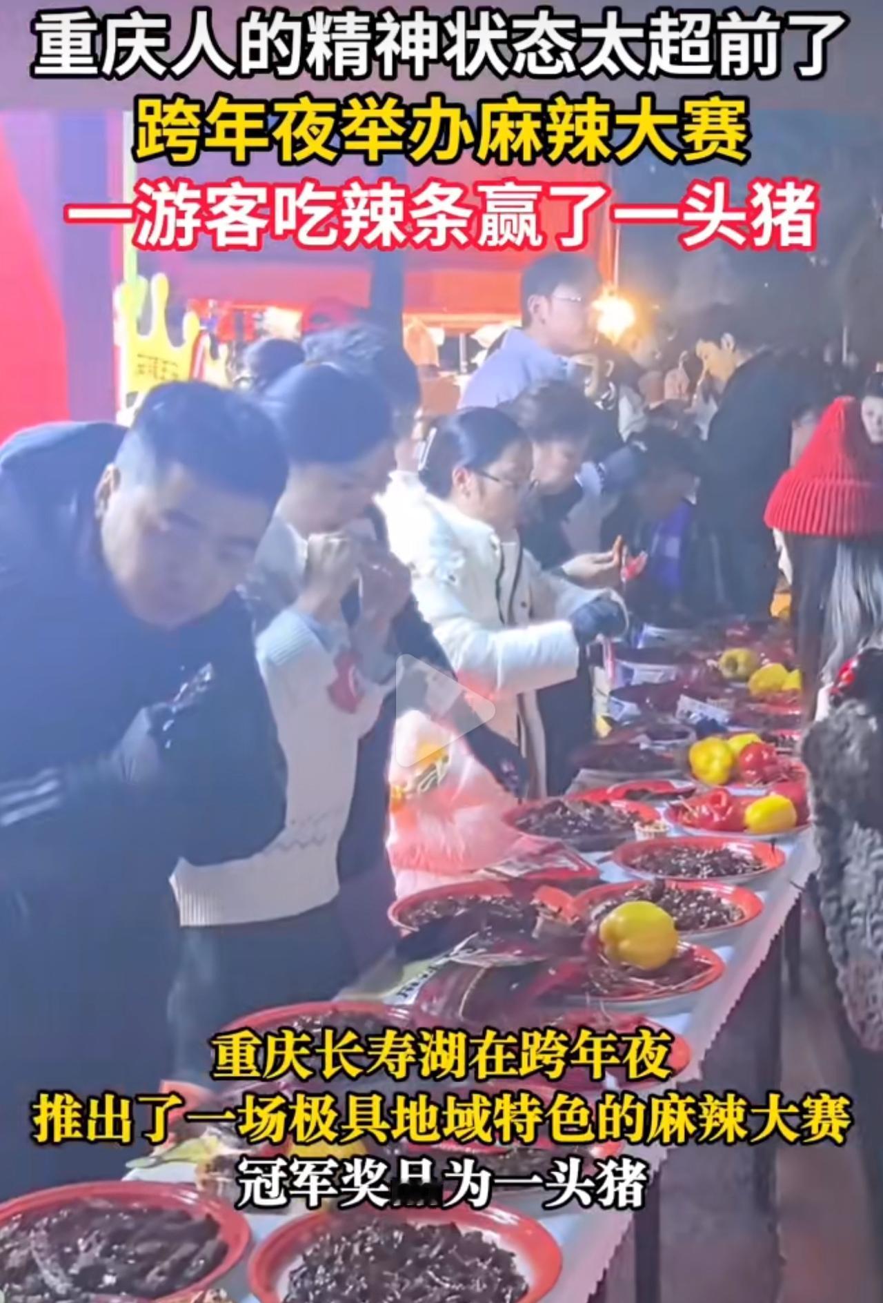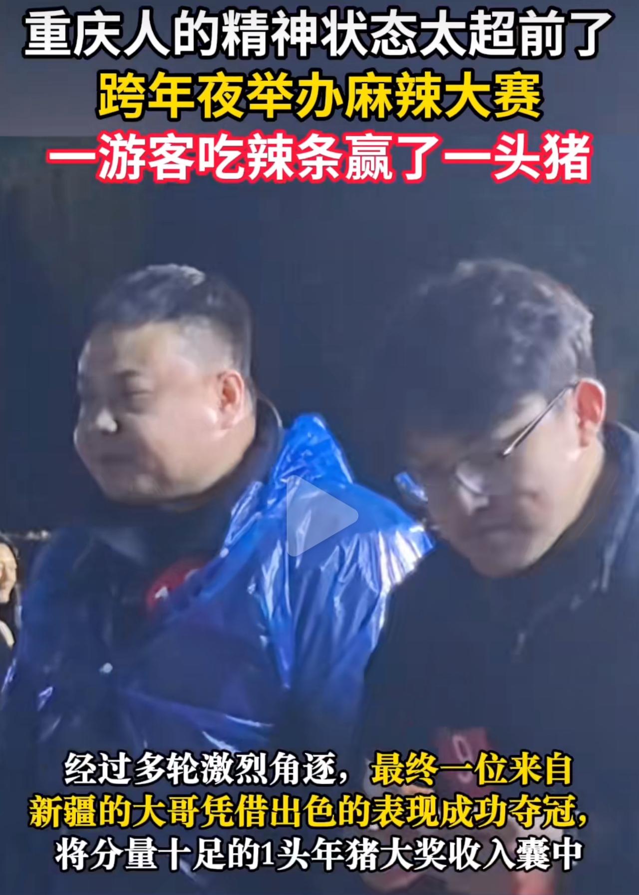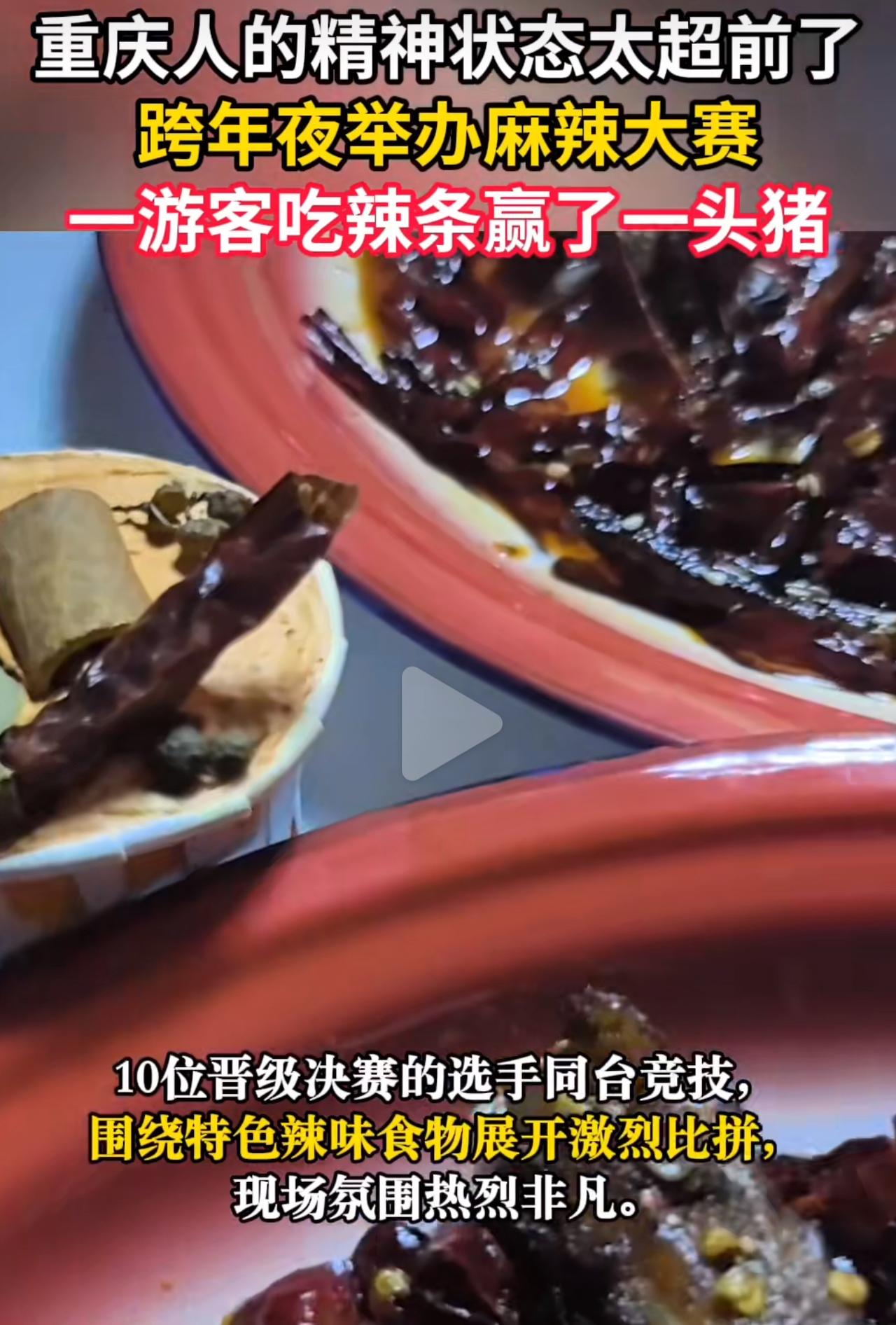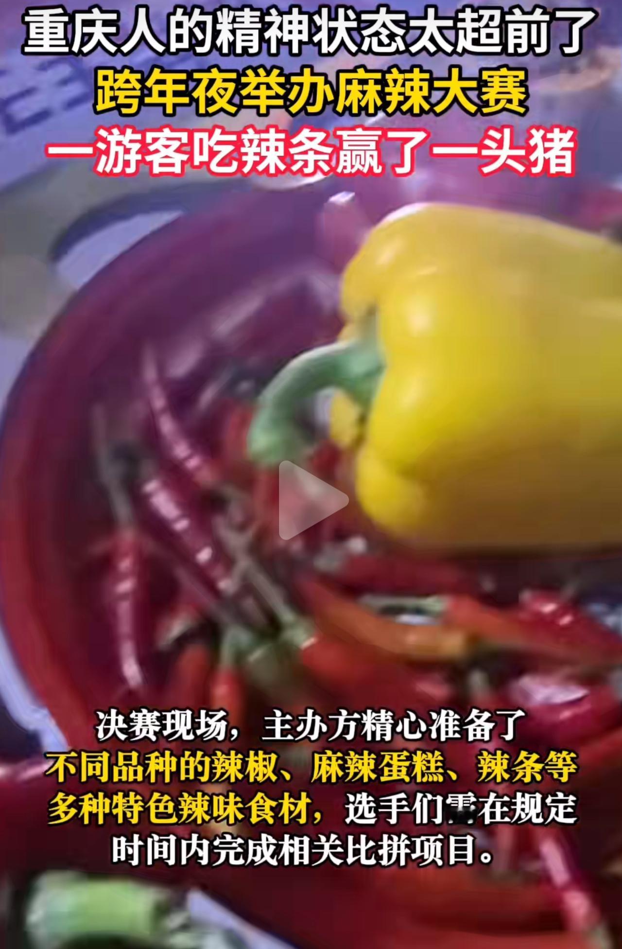 重庆主场比吃辣,夺冠的居然是个新疆大哥?2025年最后一天,景区那场跨年麻辣大赛,这波逆袭直接把现场人看傻了! 10个决赛选手同台拼狠,不光要啃生辣椒,还得挑战麻辣蛋糕、爆辣辣条。台上选手一个个辣得满脸通红,猛灌矿泉水,台下围观的人看得又紧张又嘴馋,直嚷嚷“隔着屏幕都觉得嗓子眼冒火”。 谁也没想到,这位新疆大哥全程脸不红气不喘,多辣的挑战都接得住,硬是凭实力拿下冠军。那头300斤的活猪一牵上台,现场直接炸了!这硬核年货太实在,够全家灌一整年腊肠、腌满一炕腊肉了! 网友彻底乐疯了,有人羡慕得不行“这年味直接拉满到明年冬天”,更多人跟着瞎操心“大哥咋把这300斤猪从重庆运回新疆啊”。还有人调侃,重庆辣都的主场,居然被新疆朋友给拿下,果然吃辣不分南北,高手真就藏在民间!这场又辣又热闹的跨年赛,也太会整活了!重庆辣王挑战赛 重庆辣椒挑战赛 辣都