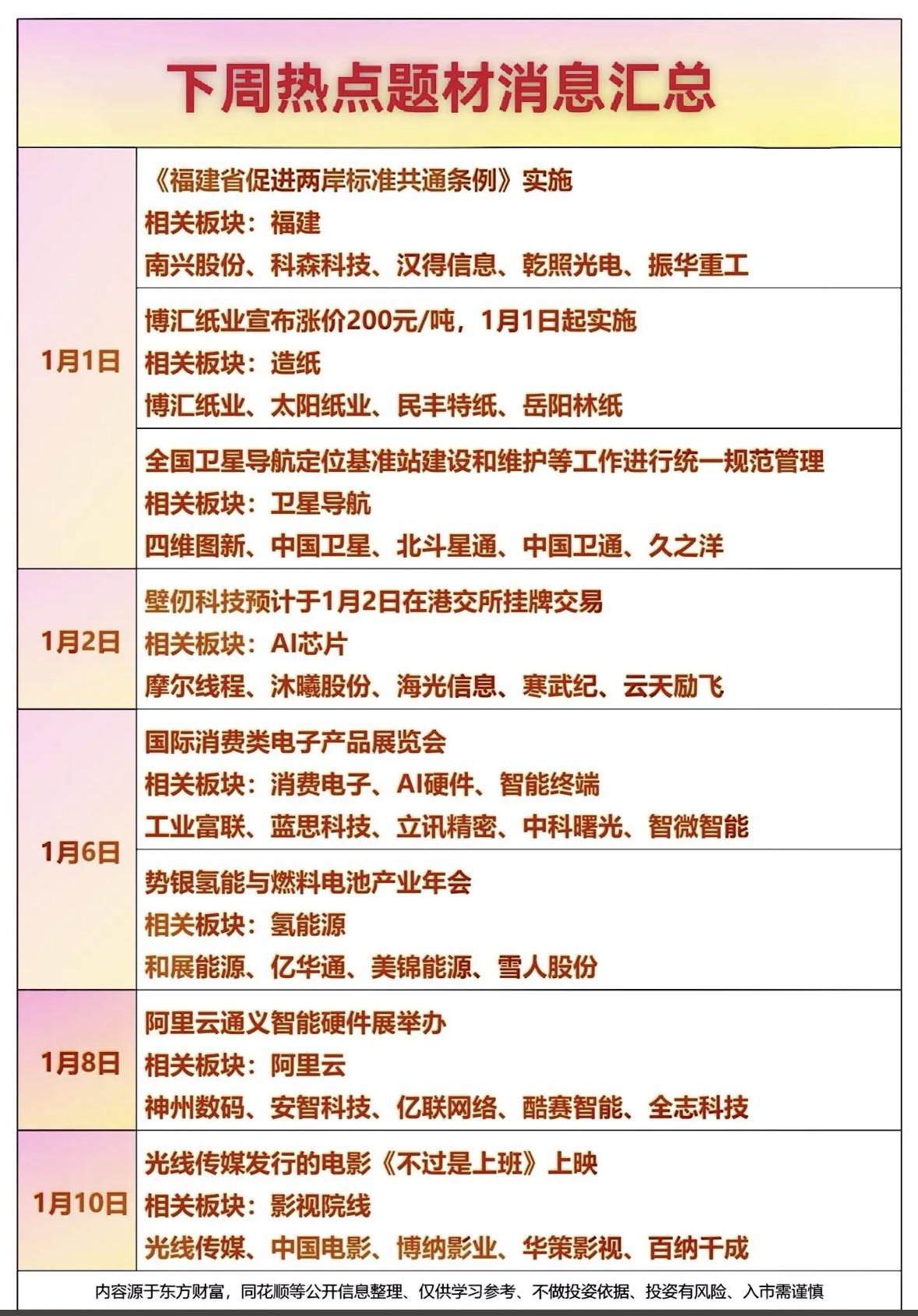 1月1日下周热点题材消息汇总,带你把握市场动态!📈📊 下周热点:两岸条例落地、 纸业涨价、卫星导航规范、 AI芯片上市、消费电子展、 氢能年会、阿里云展会、新片上映。
