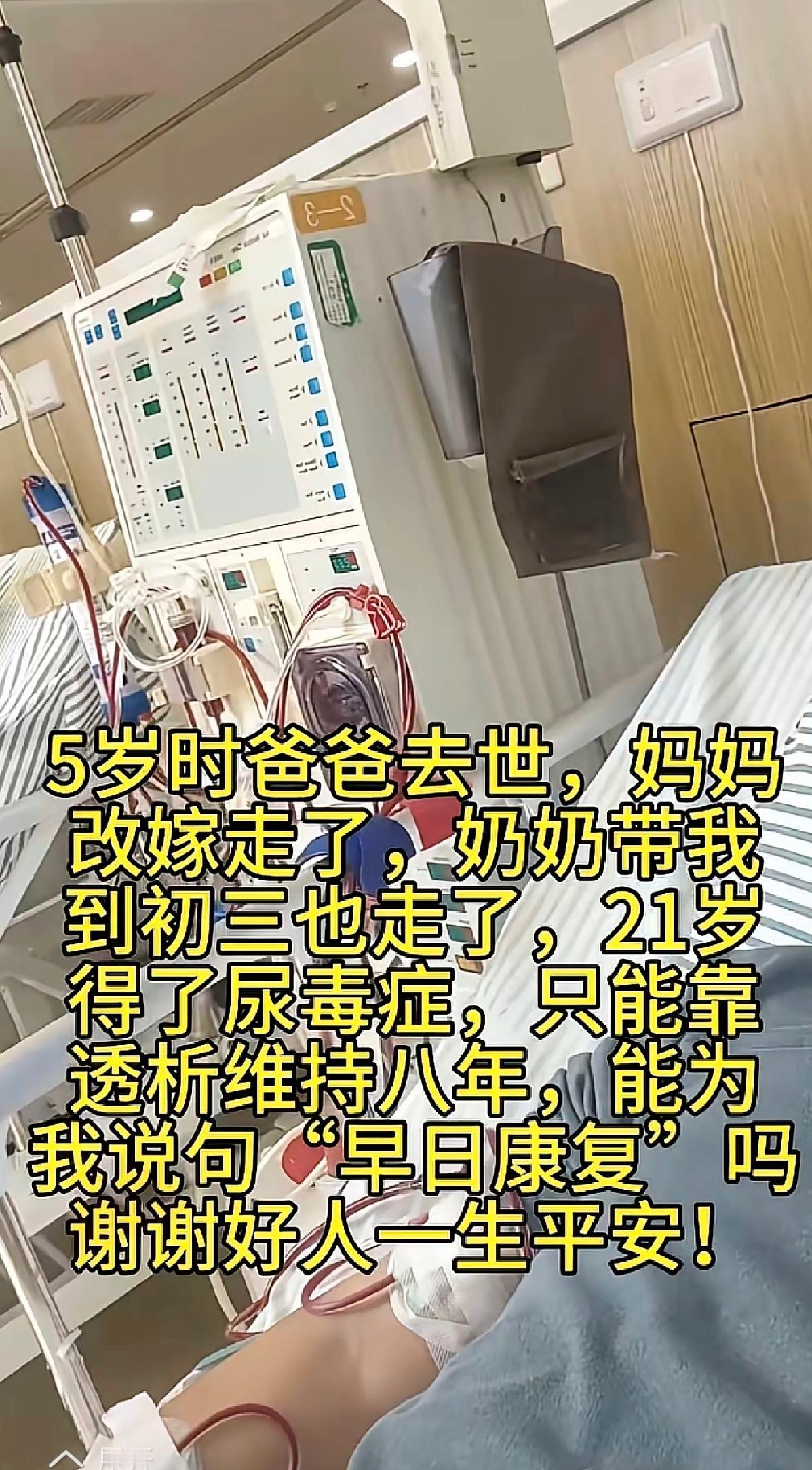 破防了!命运接连捶打,他却还在盼一句“早日康复”,看哭无数人! 五岁没了爸爸,妈妈改嫁离开,好不容易被奶奶带到初三,唯一的依靠也走了。21岁又患上尿毒症,靠着透析硬扛了八年,他的人生好像一直在闯关,可每一关都难到让人喘不过气。 但他没有抱怨命运的不公,只是轻声求一句祝福,这份隐忍和坚强,比任何故事都戳心。 其实从来不是“苦尽”才会“甘来”,而是每一个咬牙坚持的日子里,都藏着向阳而生的力量。 陌生人的一句祝福,或许就是他撑下去的一束光。 愿他透析顺利,身体少些疼痛,往后的日子能被温柔以待。 你愿意为他送上一句加油吗?评论区里留个暖心祝福吧~尿毒症小男孩