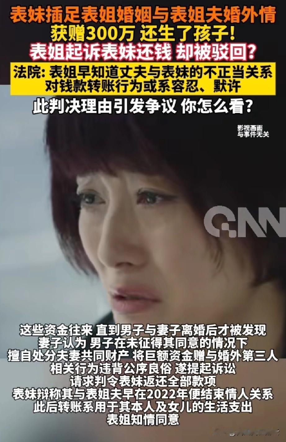 海南,表妹插足表姐的婚姻,还和表姐夫生了孩子,两人的婚外情持续了12年之久。这期间,表姐夫陆续给表妹转账300多万。 表姐直到和丈夫离婚时,才知道丈夫给过表妹这么多钱。表姐很气愤,就向法院起诉,要求表妹返还部分钱款。她觉得丈夫未经自己允许处置夫妻共同财产,违背了公序良俗。 表妹辩称,表姐知道表姐夫给她转钱。她和表姐夫的关系在他们离婚前就已经结束了,这些钱是给她和孩子的生活费。 法院判表姐败诉,原因是表姐对丈夫的婚外情知情,丈夫给表妹和孩子钱时她也同意了。这说明她对丈夫的转账是容忍和默许的。 我觉得这个事可能是表姐知道丈夫给表妹转账,但她不知道具体转了多少。丈夫欺骗了她。当她发现有300多万时,才发现上当了,想追回属于自己的那部分钱。 对于这件事,你怎么看呢?