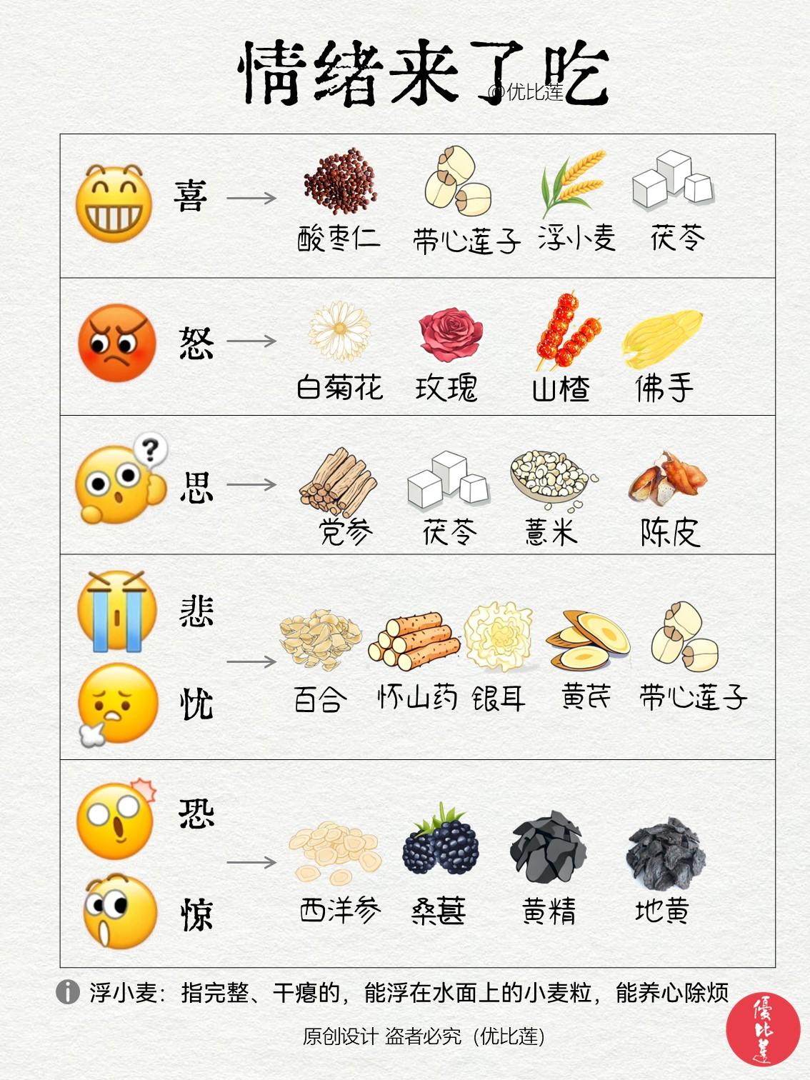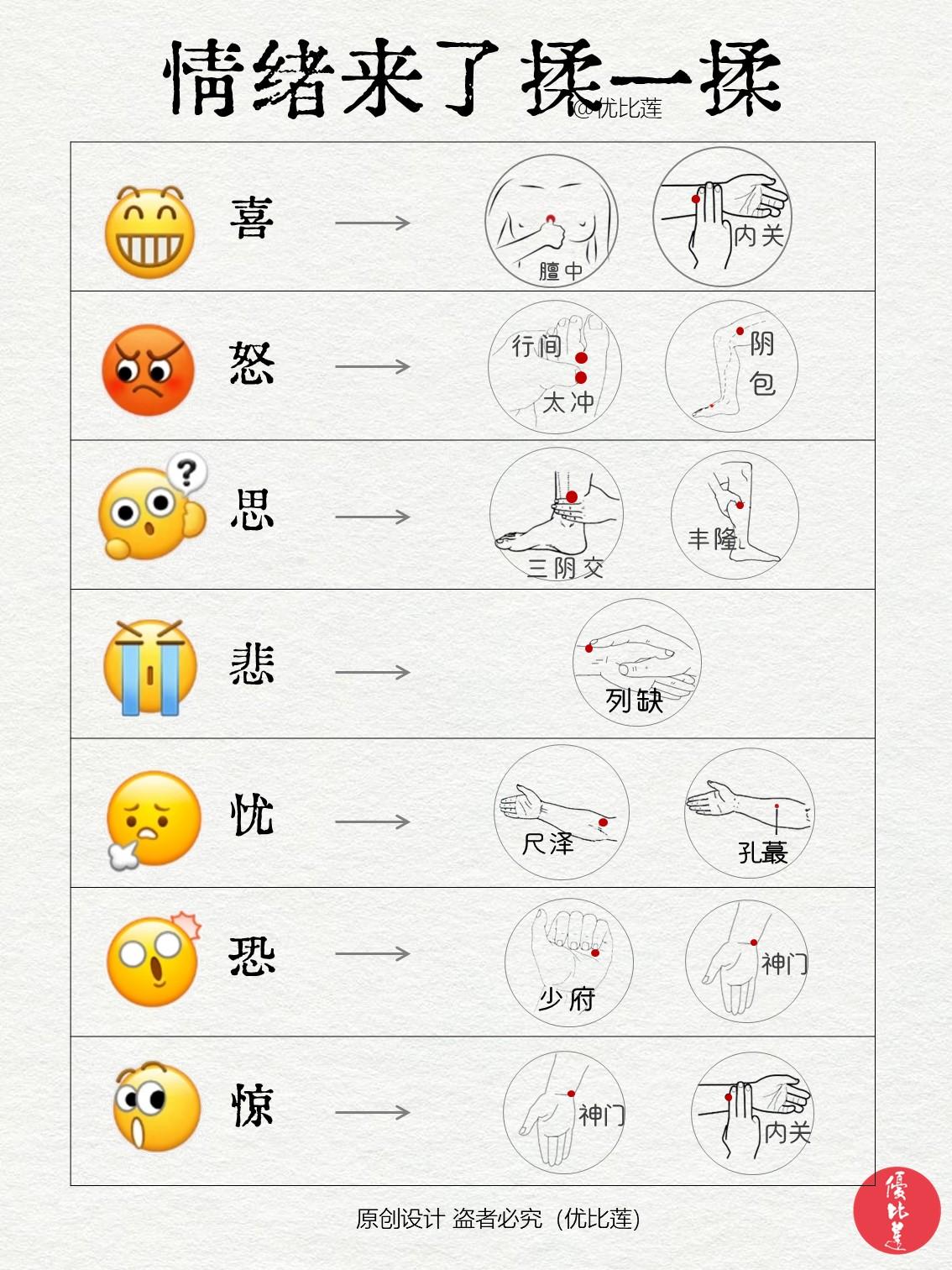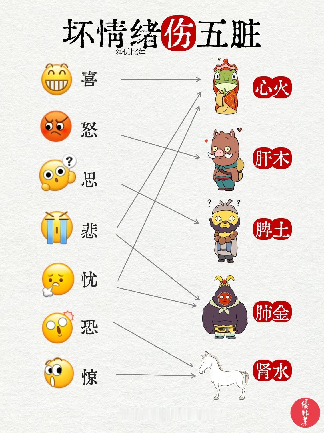 【坏情绪伤五脏,情绪崩溃一次,五脏伤一次~】 怒伤肝:肝主怒,怒则气上,使肝气上逆。发怒容易导致头~痛、血压飙升,如怒发冲冠 喜伤心:心主喜,喜则气缓, 使心气涣散。过于高兴易伤心神,容易出现失眠、心慌,心神不宁, “范进中举”就是个典型 思伤脾:脾主运化,思则气结,影响脾胃运化,容易出现没胃口、消化不好、胃不舒服等 忧悲伤肺(及心):悲则气消,过度消耗肺气与心气,导致肺气虚弱,就像林妹妹似的 惊恐伤肾:恐则气下,惊则气乱。惊恐的时候,伤的是肾气,如心神不宁、“吓尿了” ,甚至失~禁 大禹治水,疏则通,堵则溃~ 情绪也是如此,宜导宜缓,忌强行压制,请温柔对待自己心中的每一道波澜~ 情绪 怎样调整好自己的情绪和心态