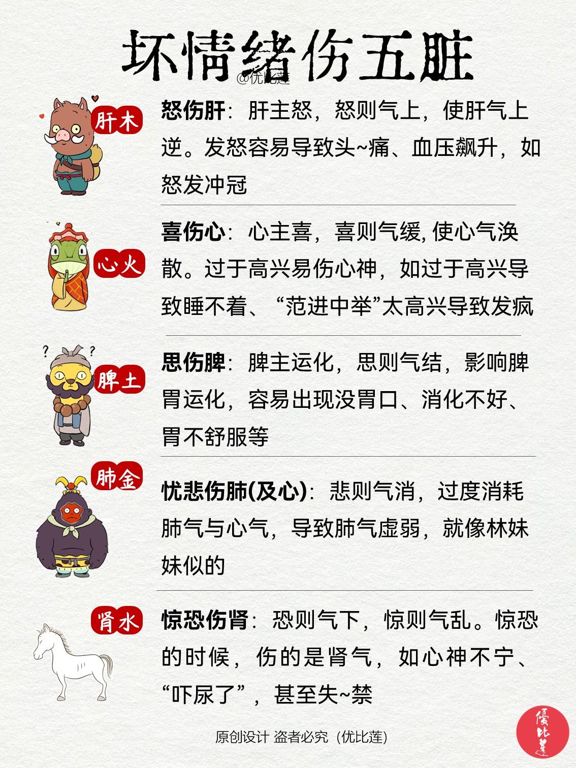【坏情绪伤五脏,情绪崩溃一次,五脏伤一次~】 怒伤肝:肝主怒,怒则气上,使肝气