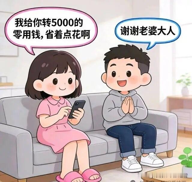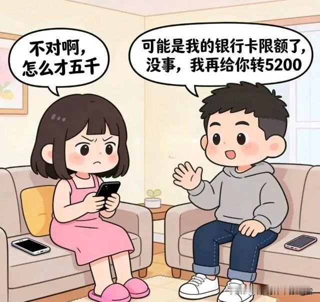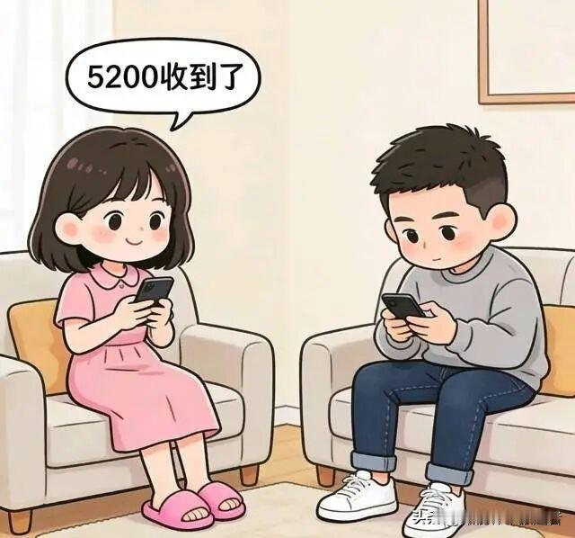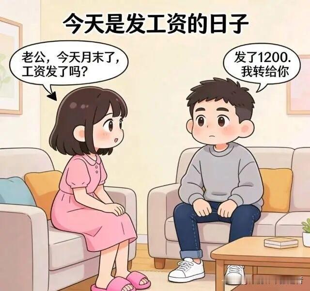 趣味漫画:今天是发工资的日子,老婆:老公,今天月末了,工资发了吗?老公:发了12000.我转给你。老婆:不对啊,怎么才五千?