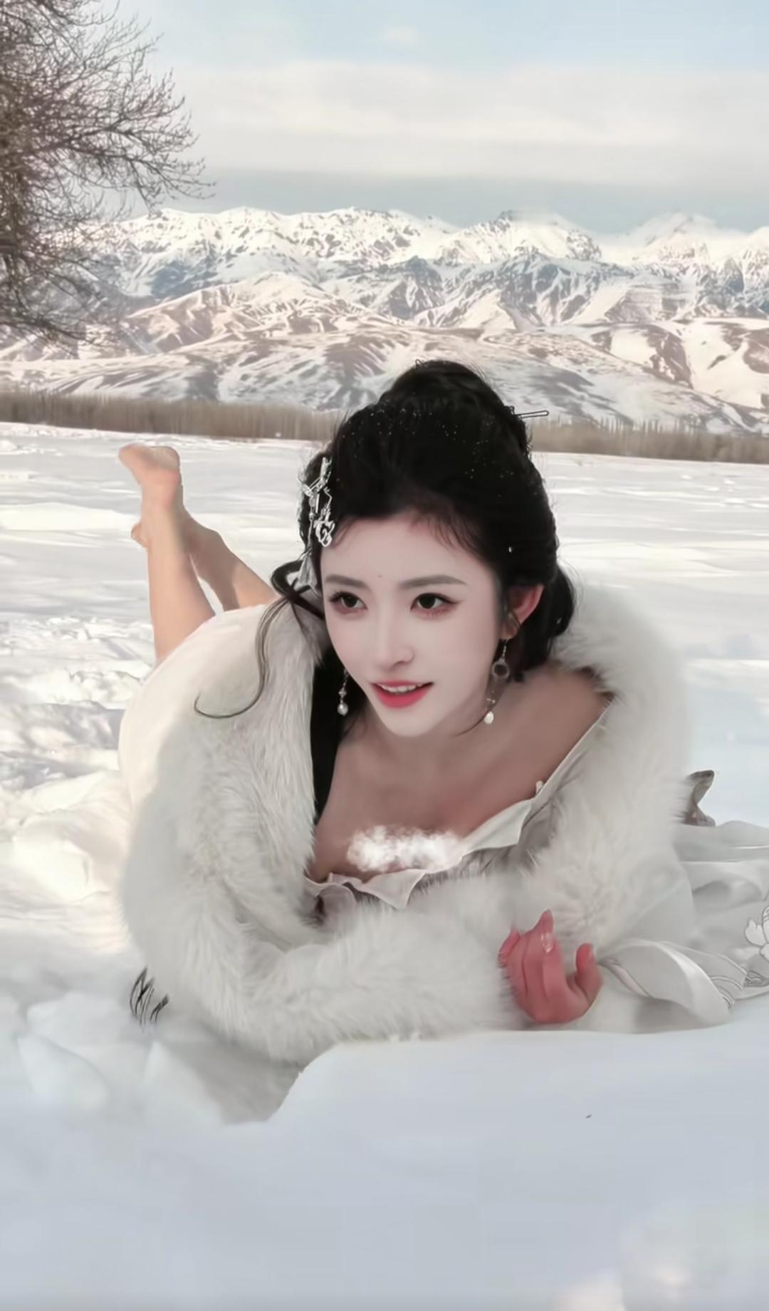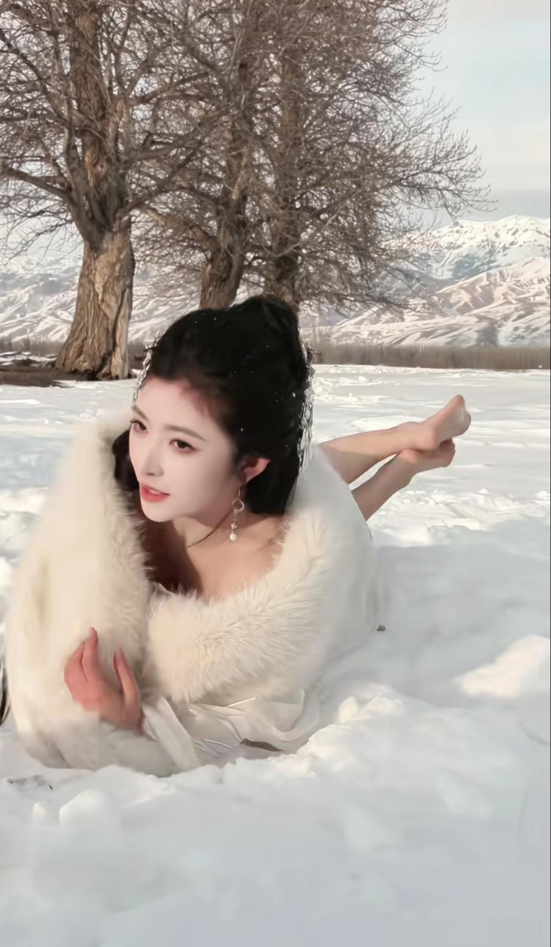 快来看,雪地里有一只白狐狸!一幅多么美丽的雪景图。[可爱]