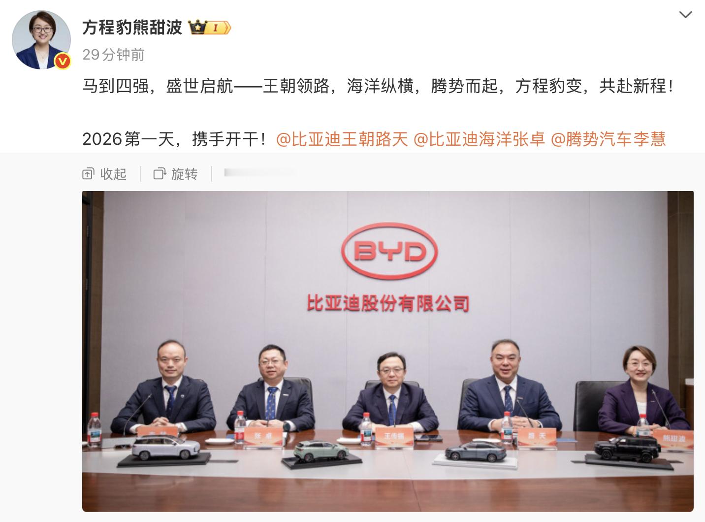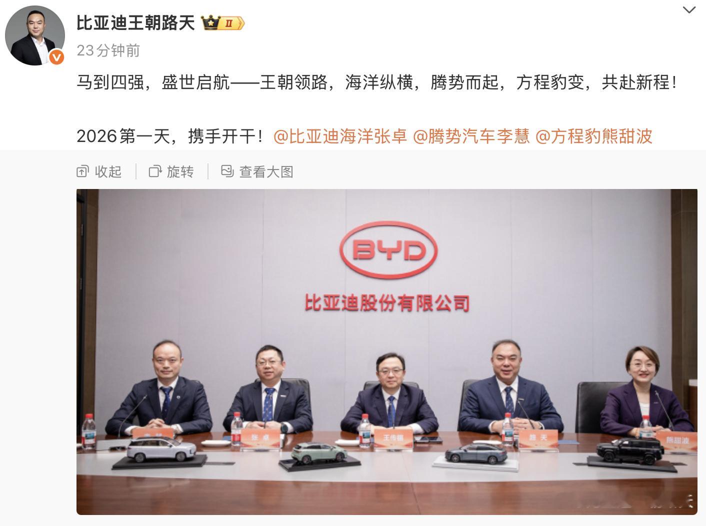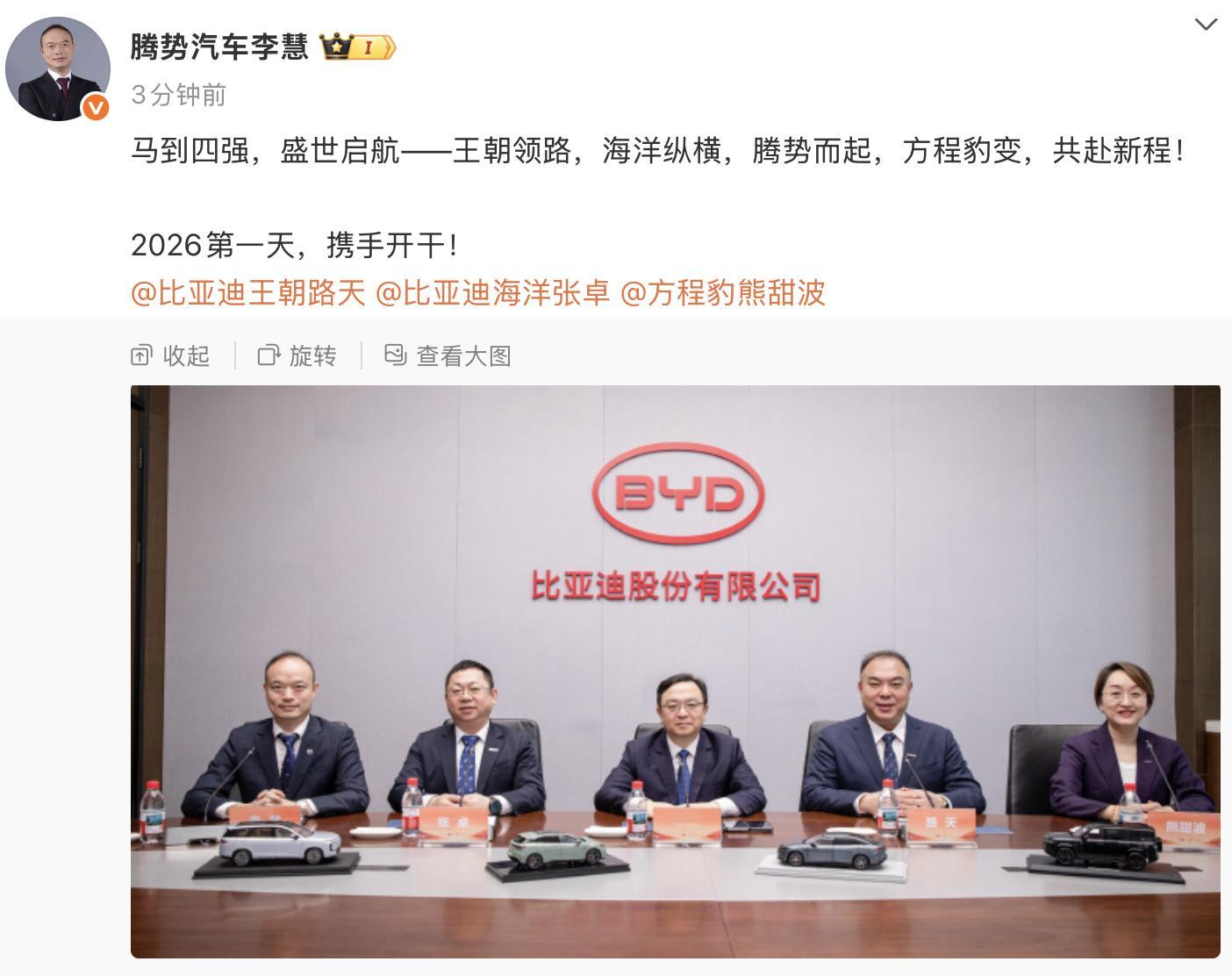 迪子几大品牌大佬跟船夫哥拍了一个新的一年的开局合影照,寓意马到四强,盛世启航——王朝领路,海洋纵横,腾势而起,方程豹变,共赴新程!估计有人会好奇,仰望呢?会不会是这个照片就是仰望的大佬拍的可能可以这么理解:这四位大佬都将在2026年带着销量任务的,既然船夫哥说要用技术感动消费者,那这些新技术显然也要逐步在这几个走量的品牌或销售体系下在2026年换个姿势竞争的。毕竟,要能打动甚至感动到消费者,可不就得让新买车的伙计们直呼“真香”?!目前能想到的技术可能会集中在安全、智能化、生态以及内外饰设计,比如包括:1、兆瓦闪充2、冰箱3、天神之眼B4、云辇-A、云辇-C5、超低风阻6、安全7、......