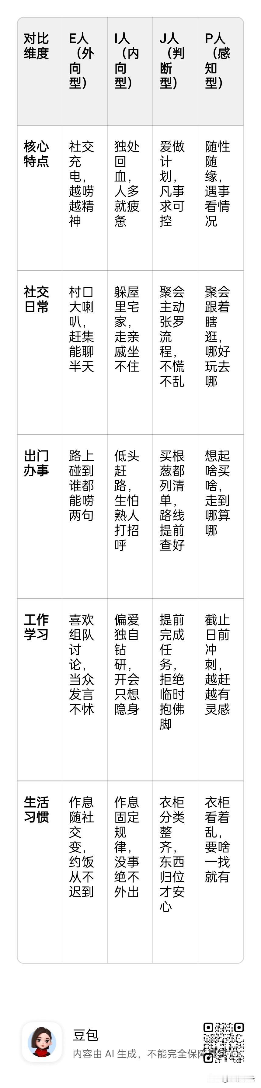 刚分清E人和I人,又来J人和P人?用大白话一次性讲透! 最近网上的“字母人”越来越多,刚搞懂E人是爱热闹的“社牛”、I人是喜安静的“社恐”,转头又刷到J人和P人吵架,不少人直呼“脑子不够用”!其实这俩跟E/I人一样,都是MBTI性格测试里的分类,说白了就是两种过日子的方式,今天用村口大爷都能听懂的话,一次性讲明白! 先复习下老朋友:E人和I人的区别,核心是“在哪充电”。E人就像村口的大喇叭,越跟人聊天越精神,赶集、聚会能从早嗨到晚,独处半天就浑身难受;I人则像自家的老黄牛,喜欢一个人待着琢磨事儿,走亲戚坐半小时就想溜,在家宅一天反而神清气爽。简单说,E人充电靠社交,I人充电靠独处,这点大家基本都能对上号。 再看新朋友:J人和P人的区别,核心是“做事咋安排”。J人就是家里的“大管家”,干啥都爱提前规划,出门买个菜都要列清单,旅游能提前半个月订好酒店、查好路线,连每天几点睡觉都卡得死死的,就喜欢一切尽在掌握的感觉。村里办红白事,最会张罗、把流程捋得明明白白的,大概率是J人。 P人则是村里的“随缘派”,主打一个“看情况定”。出门逛街想起啥买啥,旅游只定个目的地,到地方再随缘找吃的住的,作业、工作不到截止日期绝不动手,还总能在最后一刻爆发灵感。你问他明天干啥,他准说“到时候再说”,衣柜看着乱,但他闭着眼都能找到想穿的衣服,这就是典型的P人。 举个真实例子:E人J人一起旅游,E人负责约伴、找热闹景点,J人负责做攻略、订车票,俩人配合天衣无缝;I人P人搭伙,I人负责找安静的小众路线,P人负责临场变通,遇到突发情况还能灵活调整,也能玩得尽兴。但如果J人跟P人同行,大概率会出现“J人嫌P人磨蹭,P人嫌J人死板”的名场面,就像教导主任带叛逆学生出门,热闹全在吵架上了。 其实这些字母标签没啥好坏,E人和I人让我们知道该怎么给自己“充电”,J人和P人让我们明白该怎么跟生活“相处”。J人可以学着偶尔放宽计划,享受点意外之喜;P人也可以试着提前做些准备,少点赶due的慌张。 最后问一句:你是爱热闹的E人还是喜安静的I人?是爱计划的J人还是随缘的P人?评论区说说你的真实日常,看看有没有同款“字母人”!