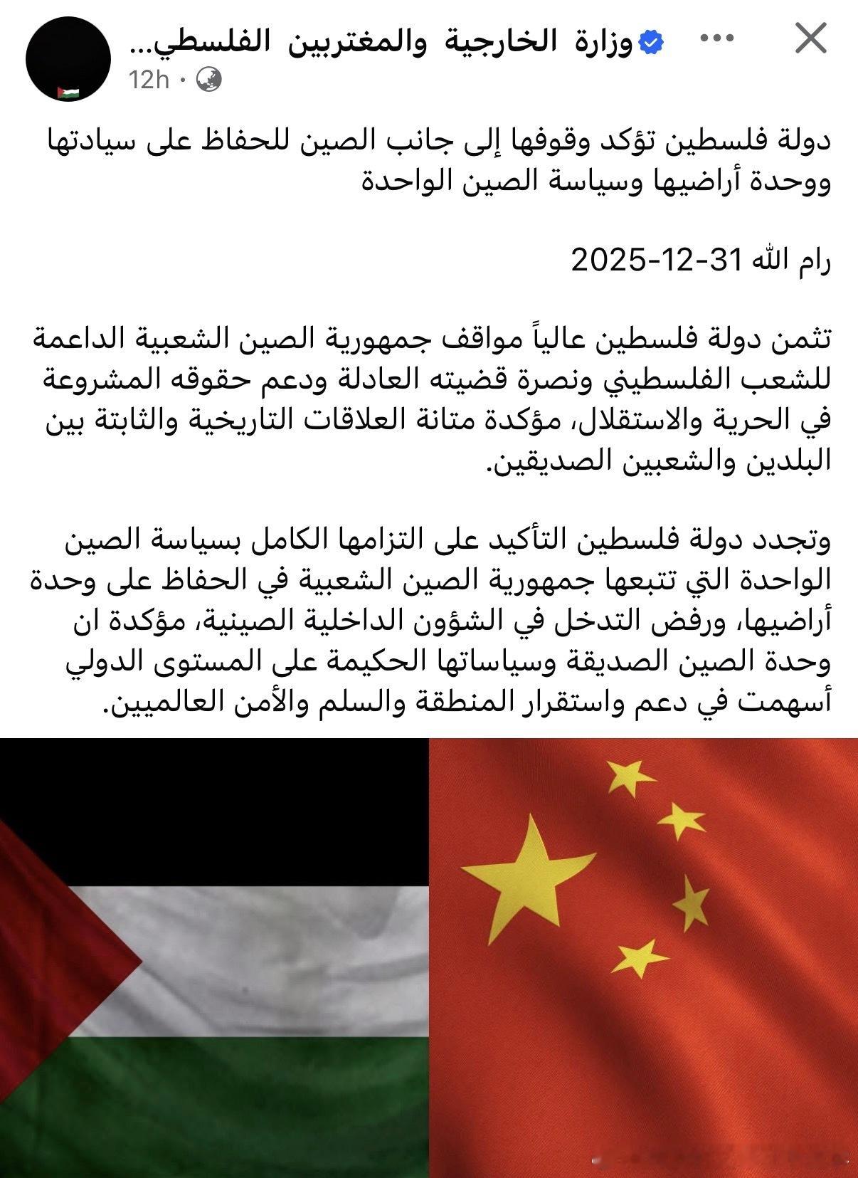 🟥巴勒斯坦国重申支持中国维护国家主权、领土完整和一个中国原则。拉姆安拉,2025年12月31日。巴勒斯坦国高度赞赏中华人民共和国长期以来对巴勒斯坦人民的支持,坚定声援巴勒斯坦正义事业,支持巴勒斯坦人民争取自由与独立的合法权利,并强调两国及两国人民之间牢固而深厚的历史友好关系。巴勒斯坦国再次重申,坚定、全面地支持中华人民共和国奉行的一个中国原则,支持中国维护国家统一和领土完整,反对任何干涉中国内政的行为。巴方强调,友好中国的国家统一以及其在国际层面采取的理性政策,为地区稳定以及世界和平与安全作出了重要贡献。🇵🇸♥️🇨🇳新年快乐新年第1天升国旗看见具体的巴勒斯坦人