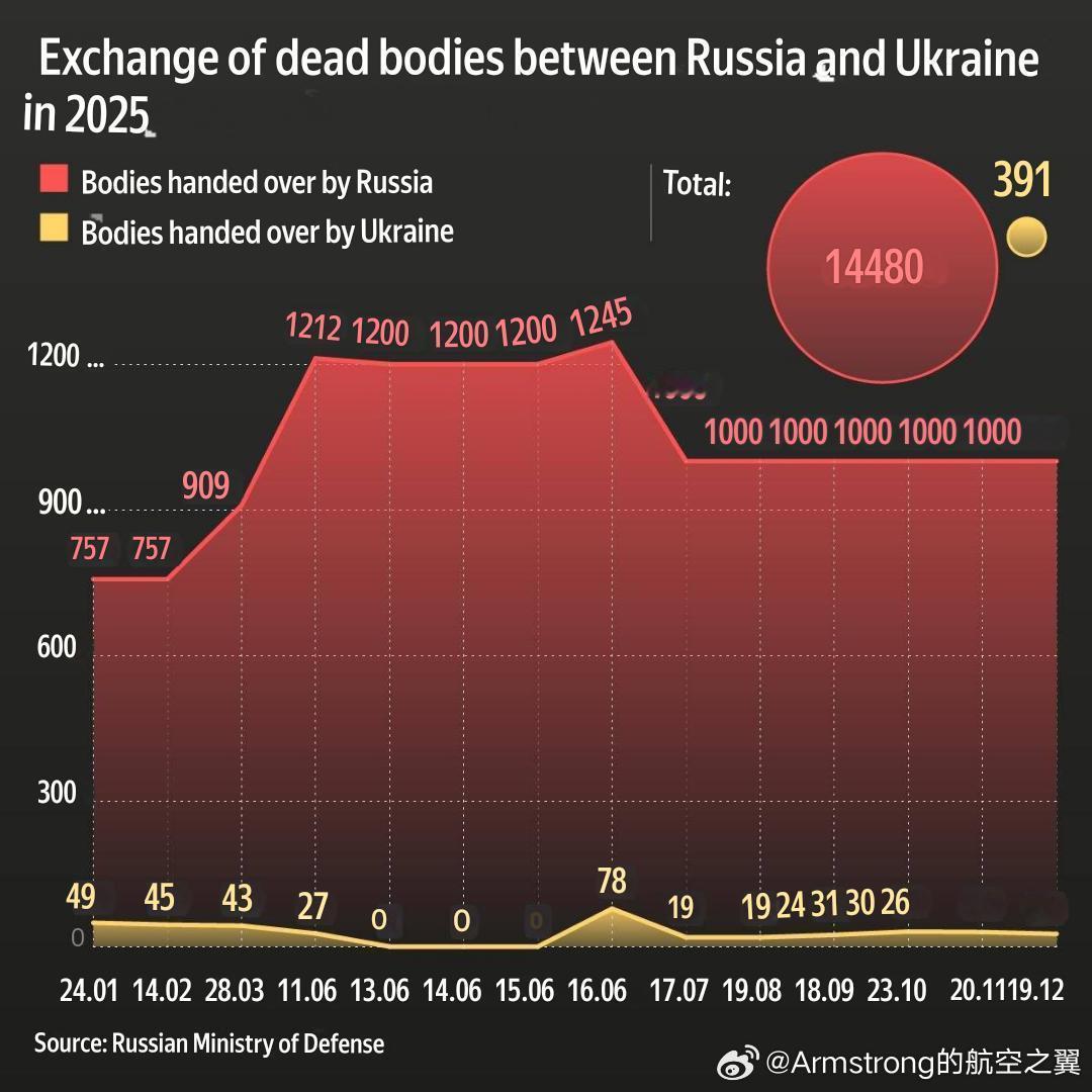 2025年俄乌两军交换阵亡士兵遗体的统计,悬殊的交换比例也能够反映出战场态势和一定程度上的损失对比。俄乌冲突