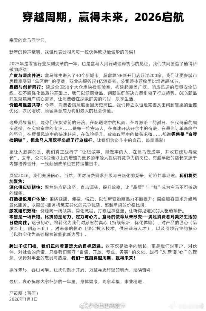 【盒马CEO严筱磊发新年全员信盒马2025年整体营收同比增速超40%】盒马CEO严筱磊今天发布的新年全员信中披露,2025年盒马整体营收同比增速超40%。根据该全员信的内容,盒马鲜生与超盒算NB双业态已服务超1亿消费者。2025年,盒马鲜生进入了40个新城市,超盒算NB新开门店超过200家。严筱磊写道,盒马将围绕“深化供应链韧性、打造极致用户体验、激发组织效能”,更好地满足消费者的消费升级需求。(新浪科技)