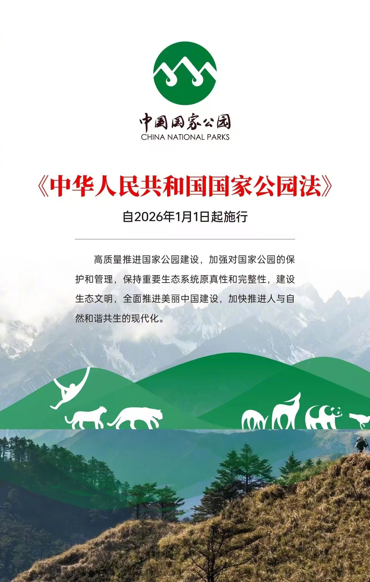 【2026年,一起读懂国家公园】《中华人民共和国国家公园法》于2026年1月1日起施行。该法共7章63条,覆盖国家公园布局设立、保护管理、参与共享、保障监督等重要环节,标志着我国国家公园建设进入了法治化、规范化的新阶段,对于推进美丽中国建设、实现人与自然和谐共生的现代化具有重大而深远的意义。(来源:国家林草局宣传中心)