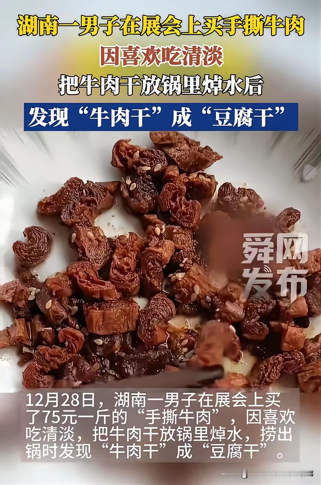 湖南男子怒了!75元一斤手撕牛肉焯水,捞出直接崩溃! 展会买的“纯牛肉干”,配料表就俩字:牛肉+食盐 只因口味清淡下锅焯个水,捞出来竟秒变豆腐干! 纹理全是大豆网状,一点牛肉纤维都没有 男子当场破防:太缺德!这钱赚得良心不痛吗? 网友炸锅:现在还有什么食品不敢造假?食品安全到底谁来管! 牛肉干造假 食品安全 离谱商家现制牛肉干 礼盒牛肉干 牛肉干辨别 素材来源于网络,侵权删除。