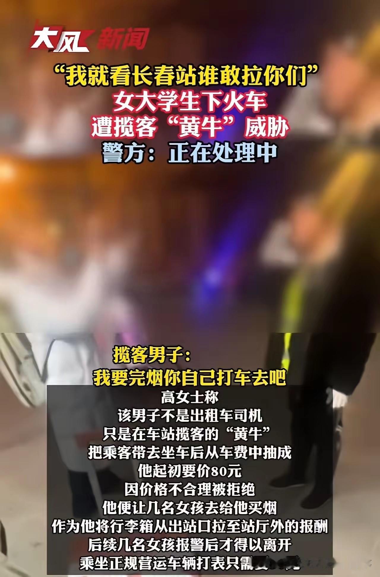 凭一已之力,坑哭长春!”几个女大学生来长春,刚走出火车站,一名男子就抢着帮她们拿行李,说带她们坐出租车。可是上车时,男子却双倍报价要70块钱,女大学生们嫌贵拒绝,男子要求给他买包烟当拿行李的报酬,女生拒绝,男子威胁:我看看今天谁敢拉你!来长春旅游 长春下跪事件 长春市大学生 素材来源于网络,侵权删除。