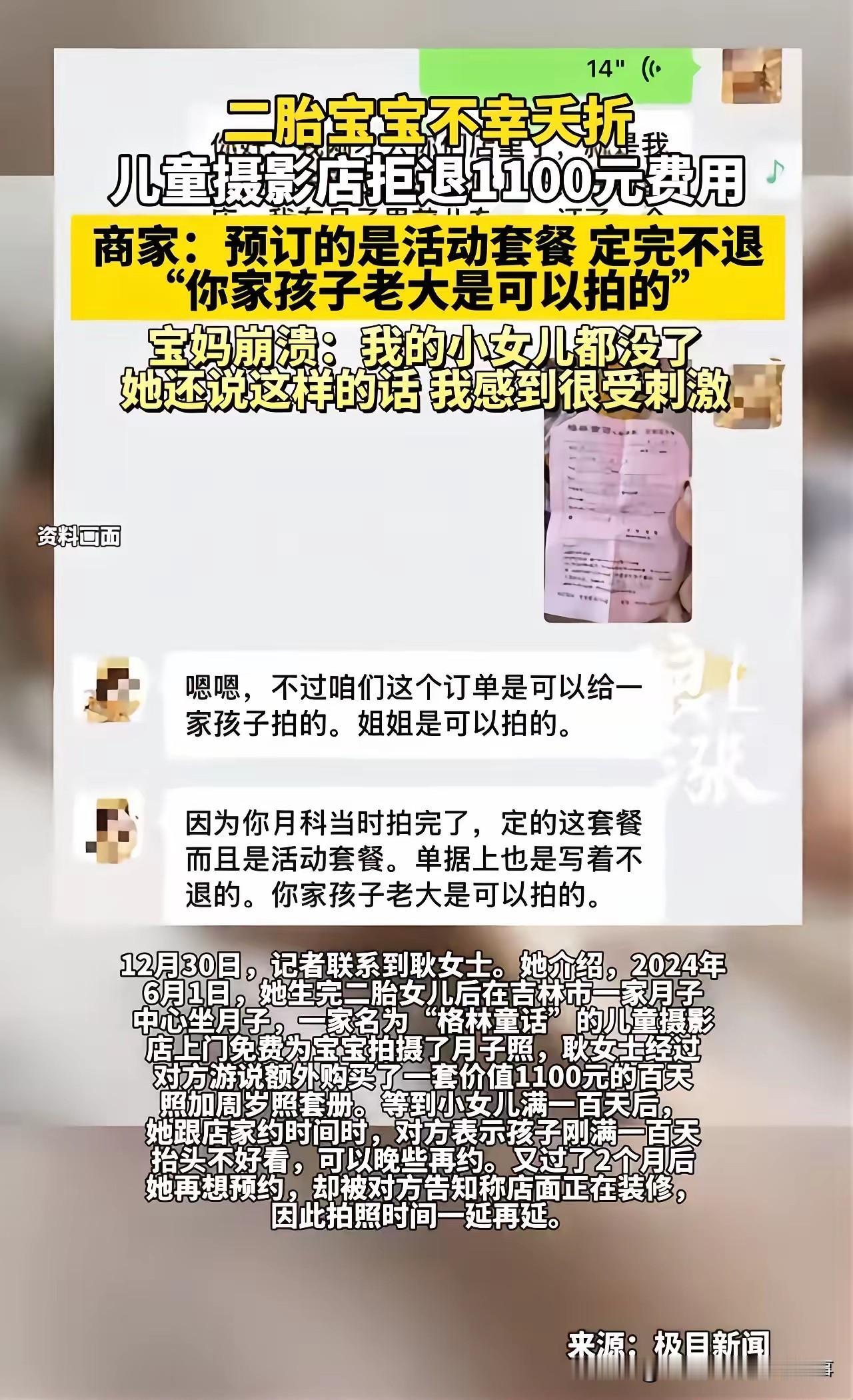 吉林痛心一幕‼️ 二胎宝宝夭折→退摄影套餐遭拒→商家:让老大拍! 1100元套餐,一次未拍 孩子确诊小脑肿瘤,家长辗转两地抢救 最终没能留住10个月大的小生命 清理遗物申请退款,却被商家的冷漠刺透心扉 律师:合同目的落空,霸王条款无效,必须退! 还好监管介入,最终退款1000元达成和解 母婴消费维权 拒绝冷漠商家 公序良俗不能丢二胎老大的痛 月嫂早产 夭折孩子 素材来源于网络,侵权删除。