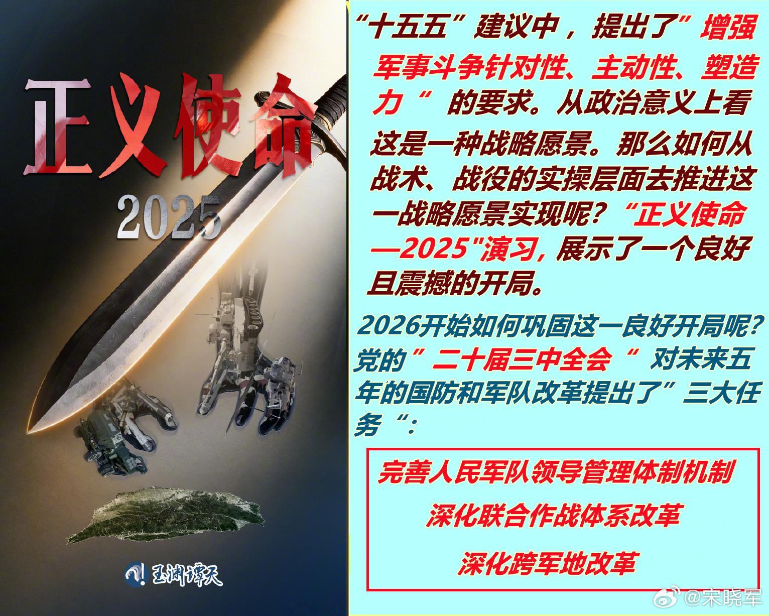 现在看,我2024年底对全年中国军事的“八字概括”,倒更像是对2025年的预期所以对2026年中国军事的预期,只能借助“正义使命-2025”演习作为开局,预祝解放军能早日把“十五五规划建议”要求的“两性一力”打磨的更加成熟、犀利。