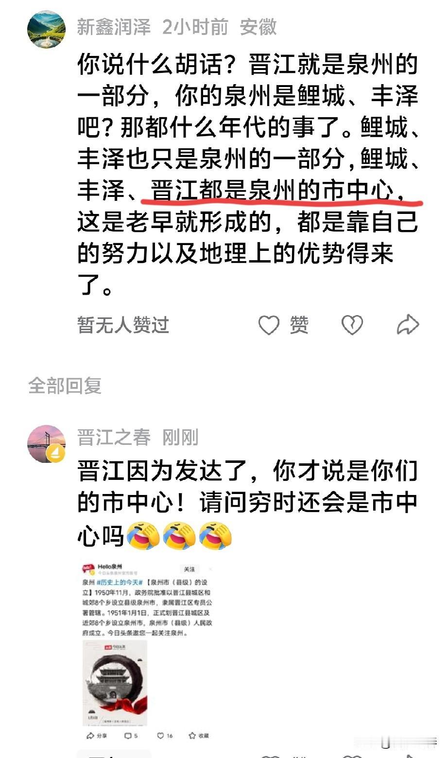晋江因为发达了,你才说是你们的市中心[捂脸][捂脸][捂脸] 那么!请问,穷时还会是你们的市中心吗[笑哭][笑哭][笑哭] 还有,请教一下!一个被代管的县级市,如何能成为你们的市中心[偷笑][偷笑][偷笑]