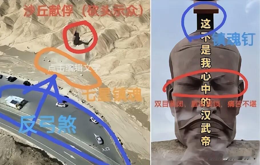 只要看过甘肃瓜州的汉武帝雕像的,都被这一幕震惊啦, 这哪里是对先人的尊重与崇拜,分明就是用心不良,整个雕塑就只是一个头颅,就像是被活埋一样,眼睛紧闭,五官扭曲,整张脸流露出的只有痛楚。 还有网友提出了“镇魂钉”“反弓煞”,“七星镇魂”等说法,也有人说这是过于解读,但是这个作者的其他作品,比如兵马俑,也都是面目狰狞,行为怪张,完全和我们心目中兵马俑的形象不匹配。 仔细查了查这个雕塑家的信息,是个华裔美国人,从沈阳鲁迅美术学院毕业后又去了美国旧金山美术学院读硕士,作品在国际上获得了一定的认可,这也就能说明一切了。