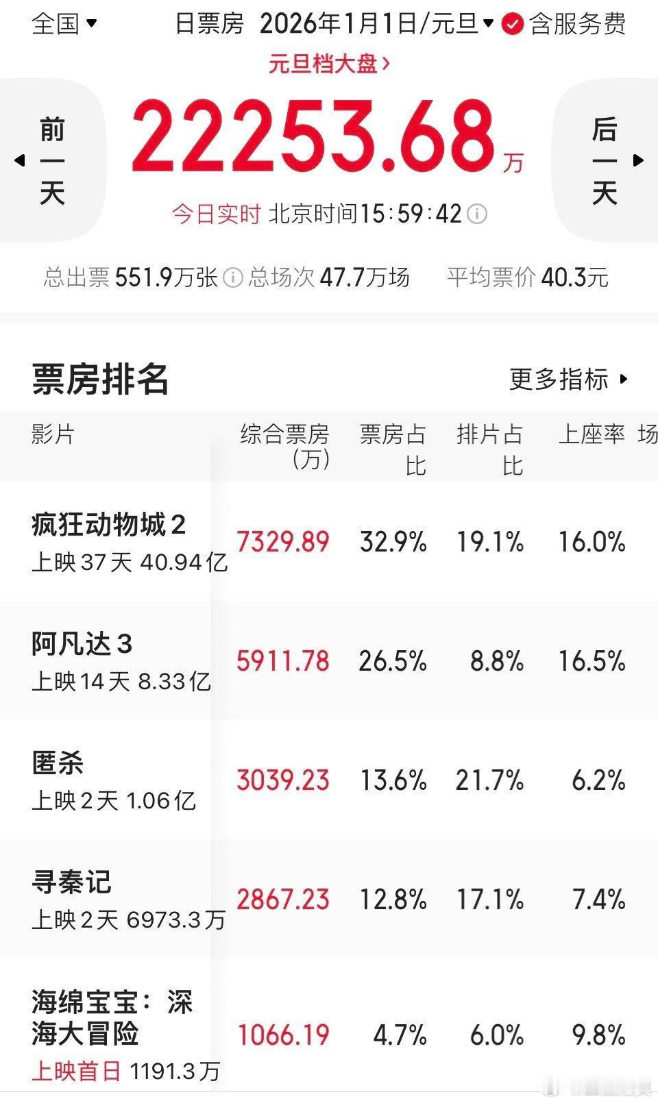 猫眼预测今天票房2.3亿+,但截至目前今天的票房已经2.2亿了。《动物城2》7300万遥遥领先,《阿凡达3》近6000万,都已经超过了预测票房。《动物城2》今天估计能冲1.5亿,《阿凡达3》今天破亿应该也是很轻松的。再多给《阿凡达3》一点上座率吧。