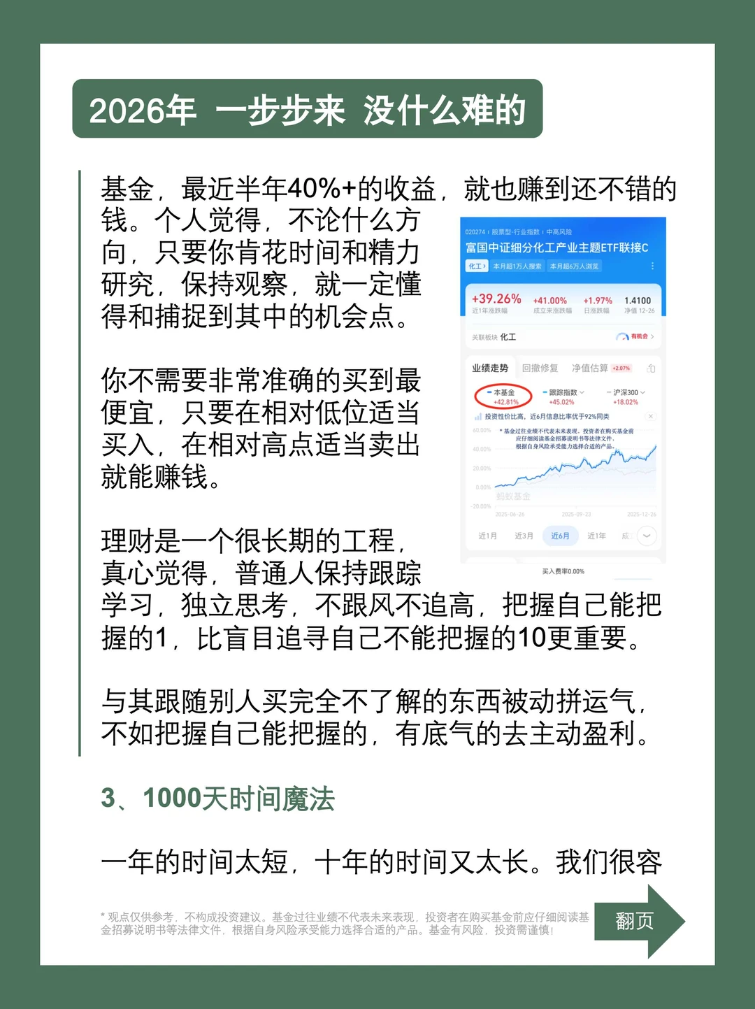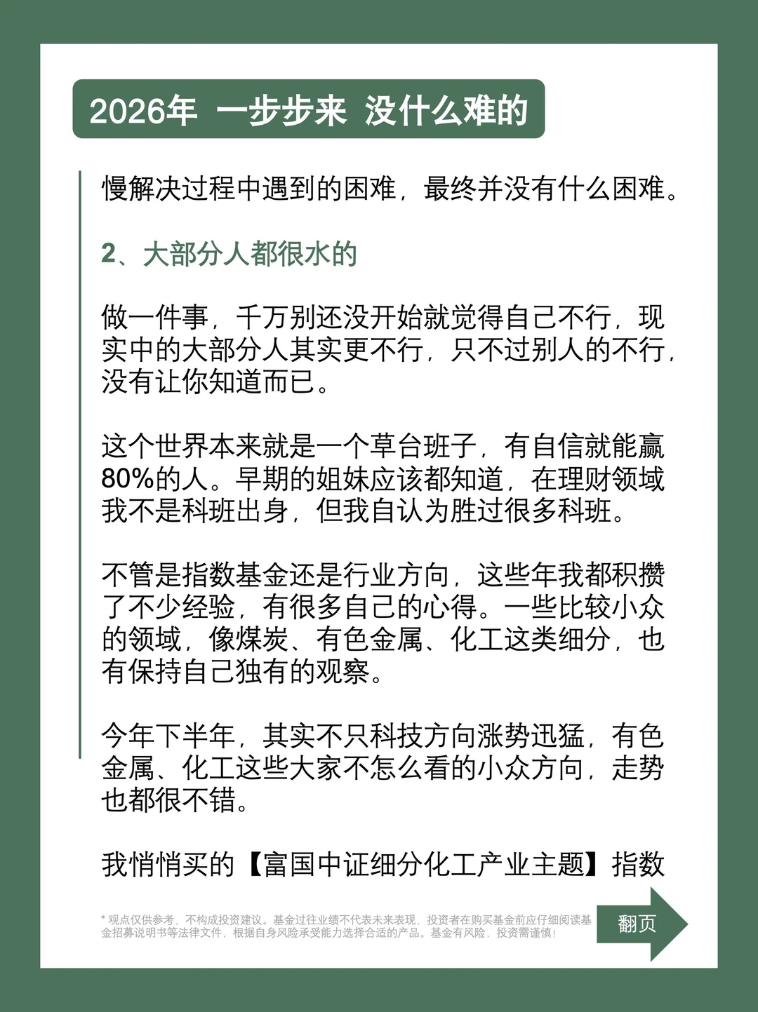 做一件事,千万别还没开始就觉得自己不行,现实中大部分人其实更不行,只不过别人的不行,没有让你知道而已,这个世界本来就是一个草台班子,有自信就能赢80%的人。在理财领域我不是科班出身,但自认为胜过很多科班。不管是指数基金还是行业方向,我都有不少自己的心得和经验。一些比较小众的领域,像煤炭、有色金属、化工这类细分,也都有自己独有的观察。今年下半年除了科技方向涨势迅猛,化工这个比较小众大家不怎么了解的方向,走的也很不错,最近半年有40%+的收益。我在这上面也是赚到了还不错的钱。