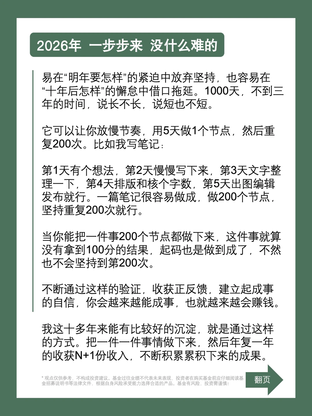 一年时间太短,十年时间又太长。1000天说长不长,说短不短,不到三年的时间刚刚好,它可以让你不紧不慢用5天做1个节点,然后重复200次。比如我写笔记,第1天有个想法,第2天写下来,第3天文字整理一下,第4天排版和核个字数,第5天出图发布就行,一篇笔记很容易做成,坚持做200个节点,重复200次就行。当你能把一件事200个节点做下来,这事就算没有拿到100分的结果,起码也是做到成了,不然也不会坚持到第200次。不断通过这样的验证,收获正反馈,建立起成事的自信,你会越来越能成事,也就越来越会赚钱。