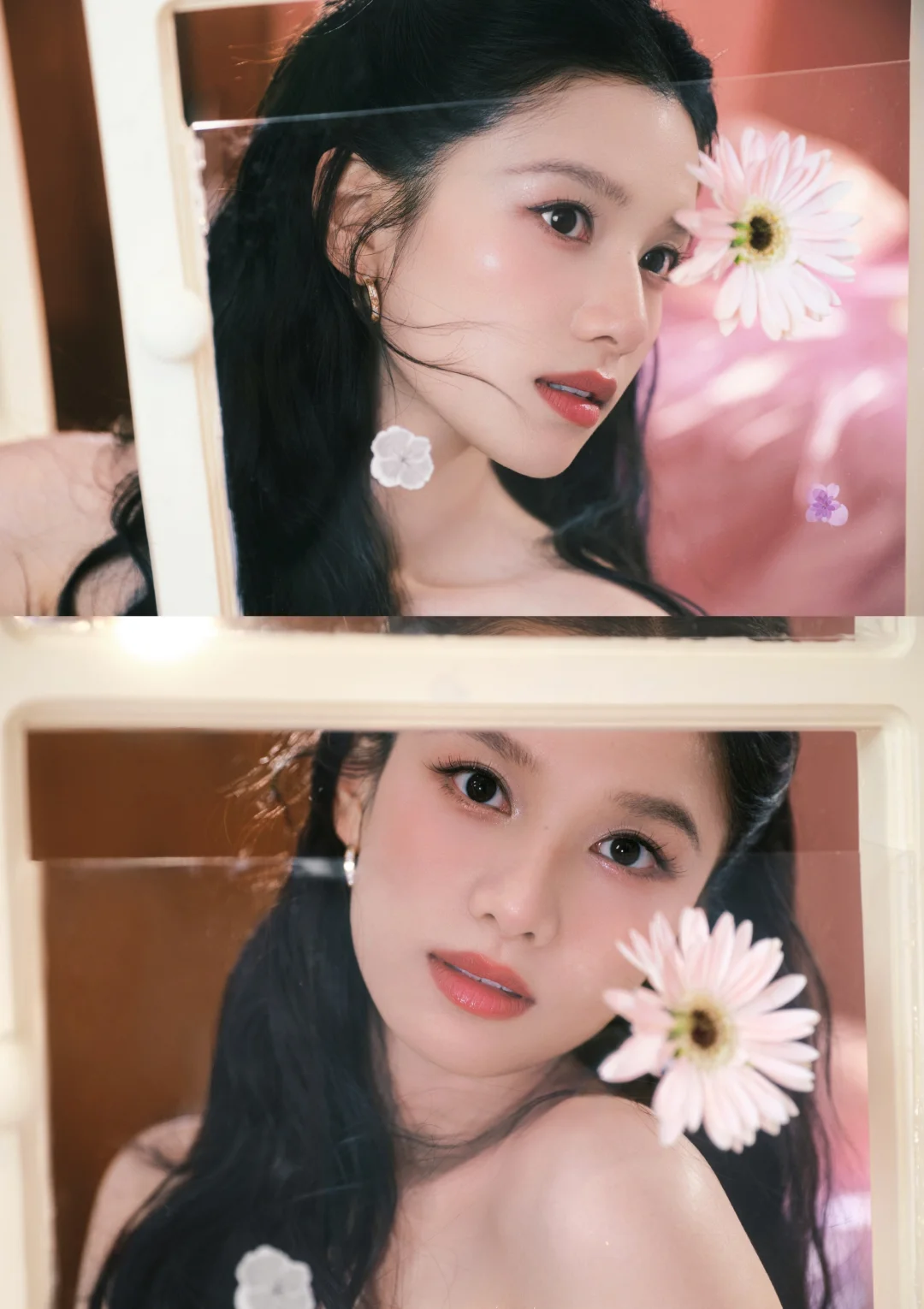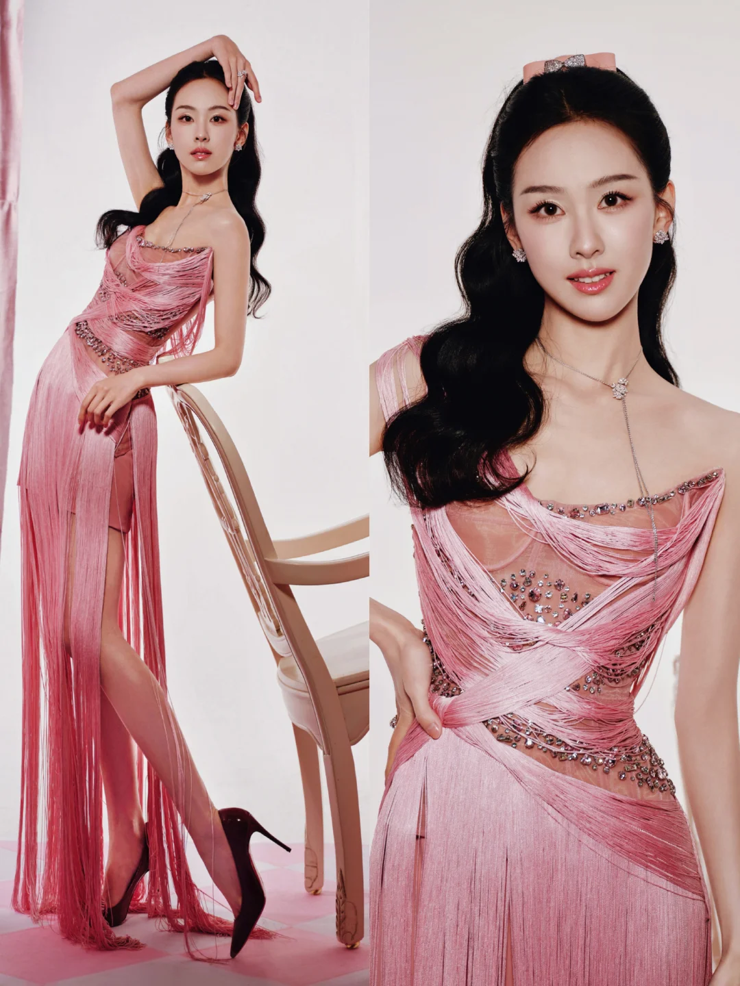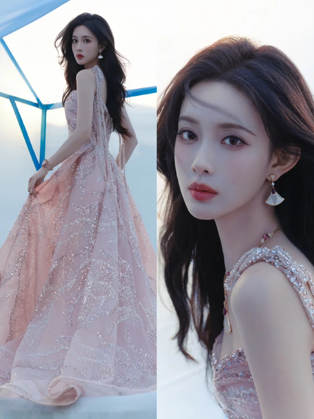 一袭粉缎抹胸长裙裹着柔光,吴宣仪的肩颈线条与锁骨曲线美得恰到好处,是行走的春日甜