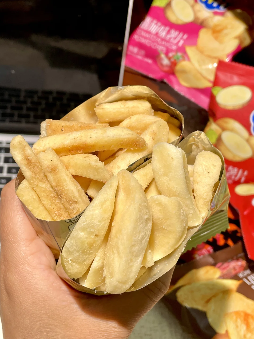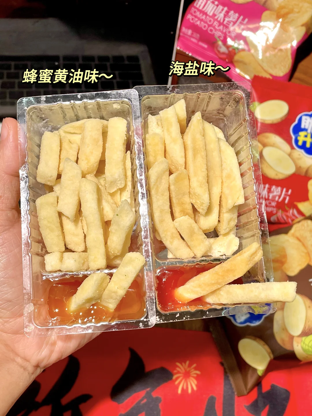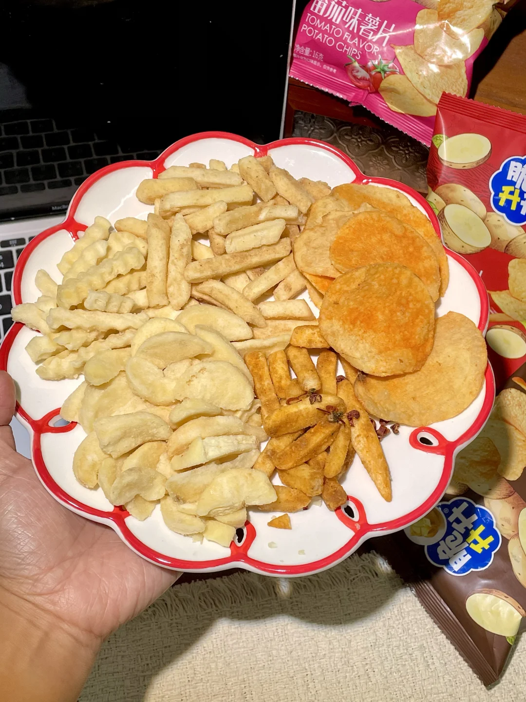 一大包里好多独立小包装,有薯片、 薯条 、薯角,十几种口味 满满一大桌!!