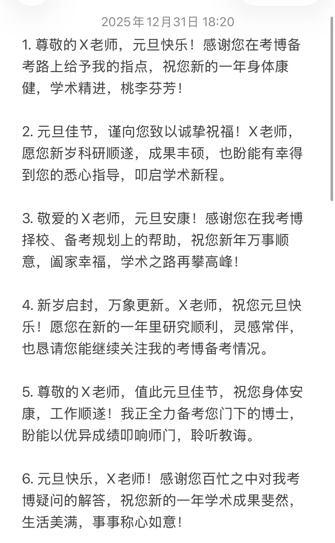 3. 敬爱的X老师,元旦安康!感谢您在我考博择校、备考规划上的帮助,祝您新年万事顺意,阖家幸福,学术之路再攀高峰!