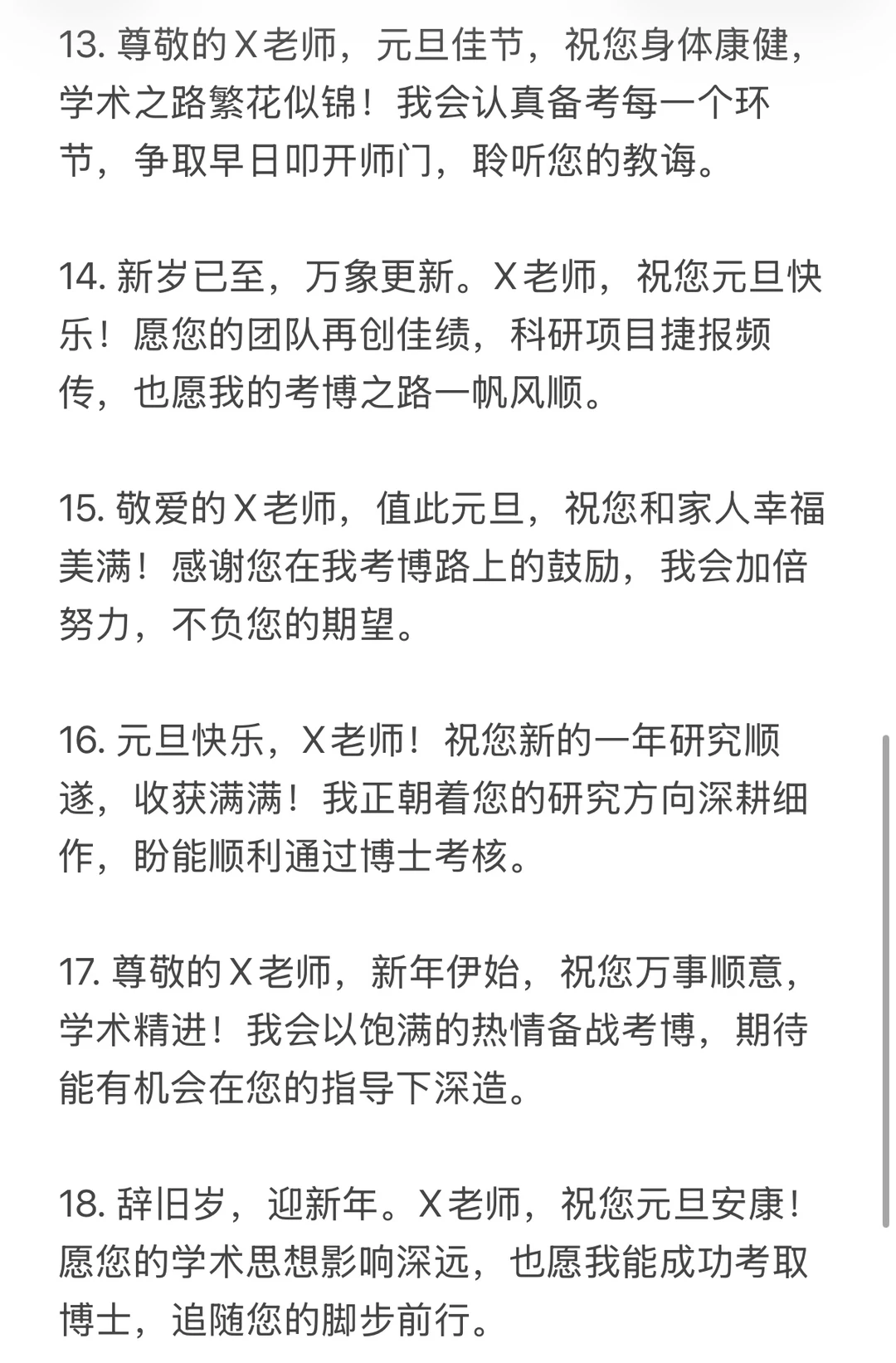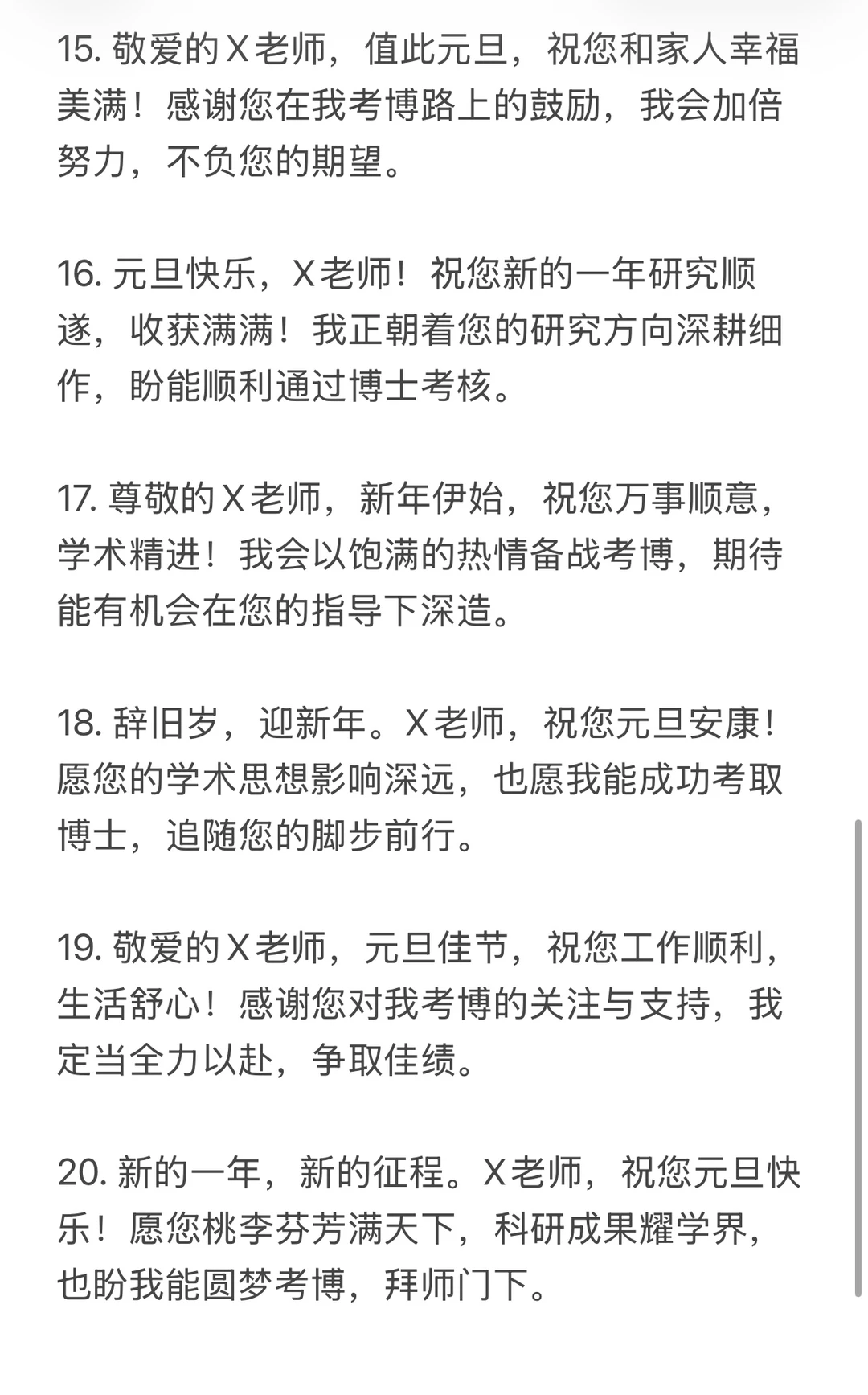 15. 敬爱的X老师,值此元旦,祝您和家人幸福美满!感谢您在我考博路上的鼓励,我会加倍努力,不负您的期望。