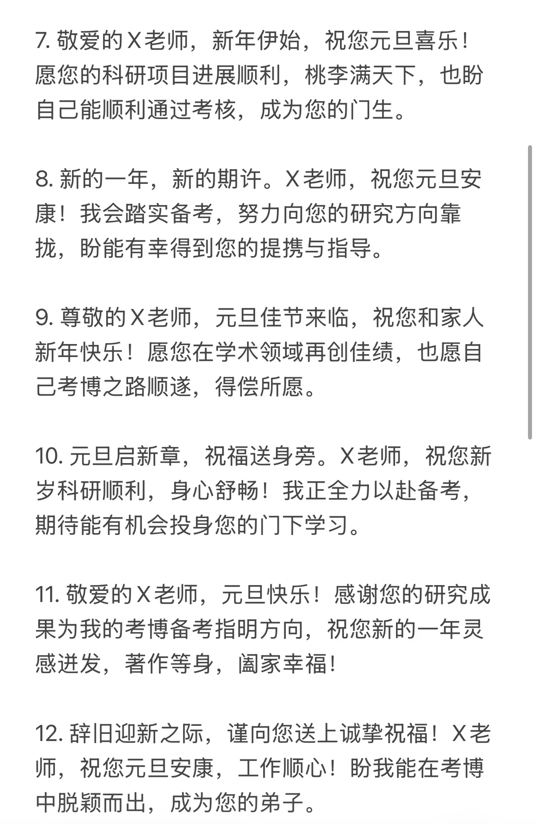 11. 敬爱的X老师,元旦快乐!感谢您的研究成果为我的考博备考指明方向,祝您新的一年灵感迸发,著作等身,阖家幸福!