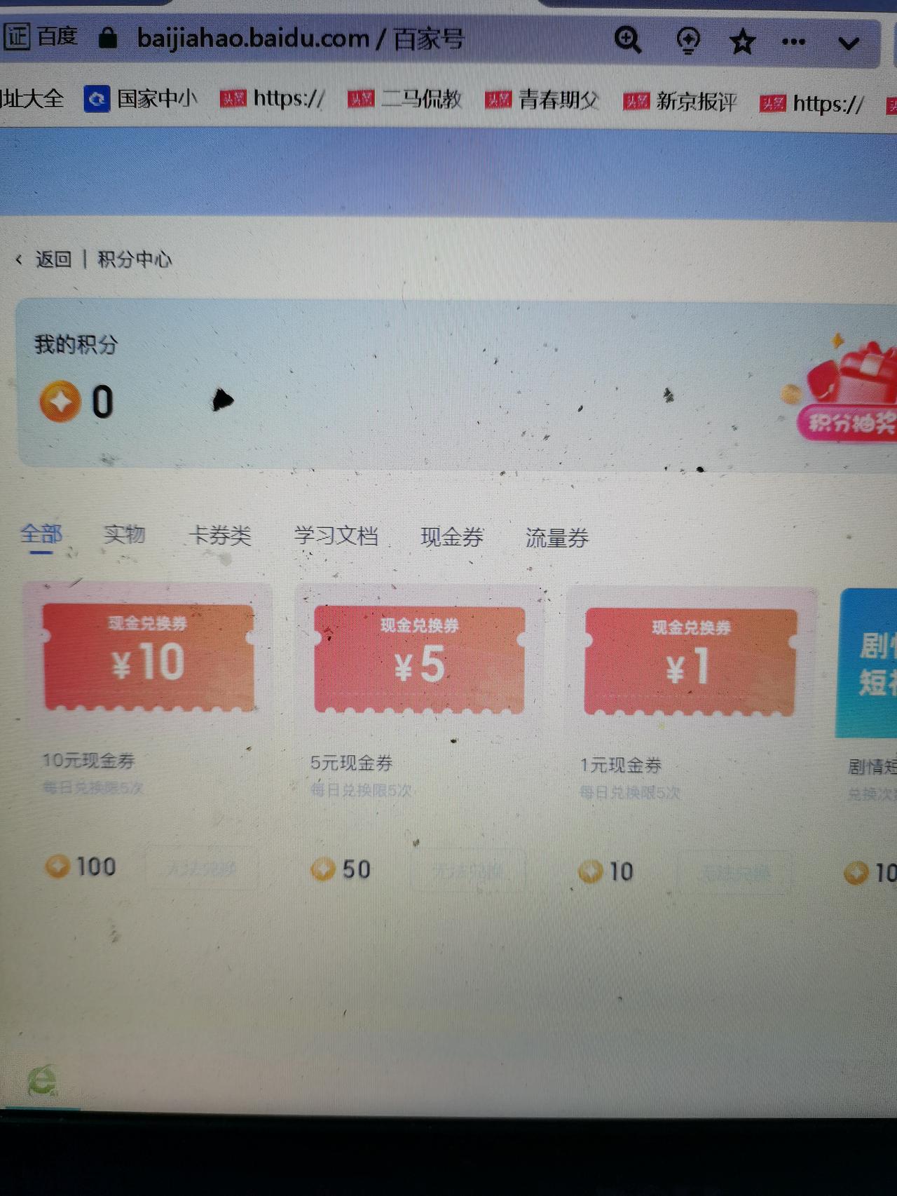 这么大的平台也耍赖。我在百家号平台有几千积分,几天前,平台提示积分即将过期,要我兑换奖品。奖品中“10元现金券”和“5元现金券”均显示“暂无库存”,只有“1元现金券”每日限兑五次。今天打开平台一看,“10元现金券”有库存,但我的积分却清零了。