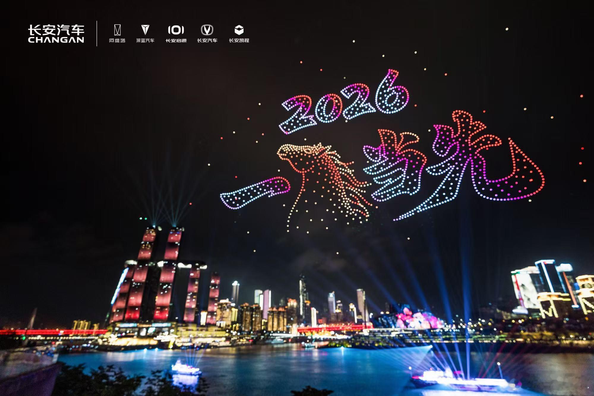 新岁已至,光影不息无人机灯光秀闪耀跨年夜用浪漫仪式启封新一年2026,祝您“一马当先”赴新程新长安新安全天枢智能新韵重庆长安同行科技长安智慧伙伴
