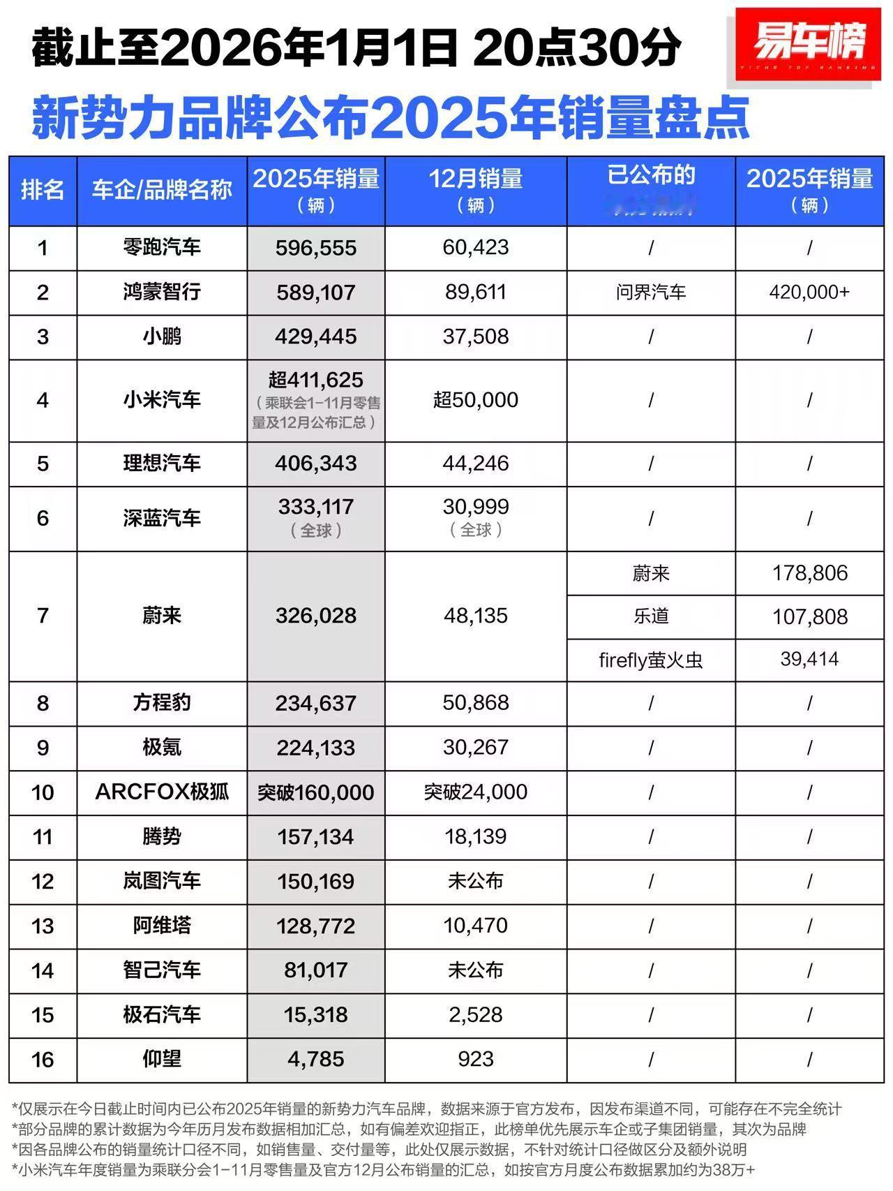 2025车圈淘汰赛初见端倪,在国产新能源车大繁荣背景下,各造车新势力都有着不菲的成绩,零跑是毫无争议的第一,鸿蒙智行今年给了不小的惊喜,小鹏成为“造车三兄弟”中的老大,真是风水轮流转,今年大开花啊!小米、深蓝、方程豹都在创新高,2026你又看好哪家新势力呢?(图:易车网)