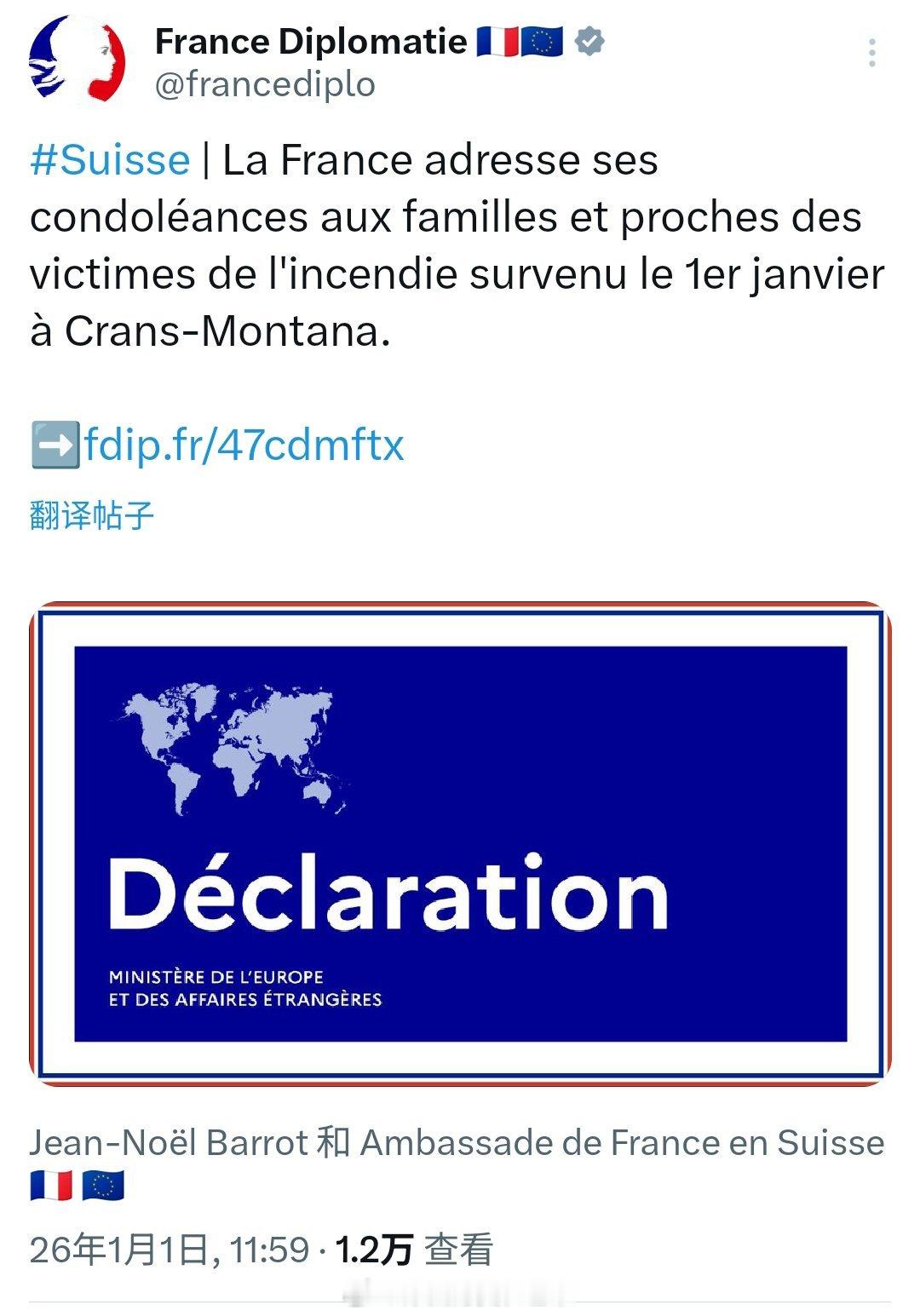 瑞士医院被烧伤患者淹没 法国外交部就1月1日发生在克朗-蒙塔纳的火灾,向遇难者的家属和亲友致以深切的哀悼。法国总统马克龙发文:对克朗-蒙塔纳火灾事件深感悲痛。我的思念与哀悼之情献给失去亲人的家庭,并向伤者致以慰问。我向瑞士、瑞士人民及其当局表达法国的完全声援,以及我们兄弟般的支持。海外新鲜事瑞士警方不认定酒吧爆炸与恐袭有关瑞士滑雪胜地爆炸10死10伤瑞士滑雪胜地爆炸多人死伤瑞士爆炸酒吧事发时正举行跨年活动