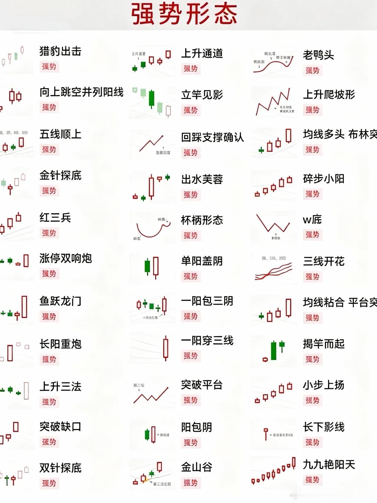2026年1月1日整理的六大经典K线强势形态,结合实战要点提炼核心操作逻辑,内容均源自技术分析:一、突破形态:空中加油 特征:跳空高开后收带长上影线的小阴线(实体实体2倍),位于45度上升通道中。 操作逻辑: 1. 买点:3日内阳线突破影线高点,且成交量温和放大。 2. 止损:收盘价跌破启动阳线开盘价。 场景:宁波富达2012年2月突破平台。三、底部反转:金针探底 特征:长下影阴/阳线(影线>实体3倍),出现在连续下跌末端。 操作逻辑: 1. 买点:次日高开高走确认,MACD底背离时加仓。 2. 止损:收盘价创新低。 场景:万业企业历史底部反转。四、均线支撑:回眸一笑 特征:股价突破30日均线后回踩10日线不破,缩量至启动前水平。 操作逻辑: 1. 买点:10日线处收小阳线+KDJ金叉。 2. 止损:有效跌破10日线3%。 场景:北特科技2017年1月主升浪起点。五、缺口突破:鱼跃龙门 特征:跳空阳线直接越过30日均线,缺口不补。 操作逻辑: 1. 买点:缺口上方缩量整理3日,分时阶梯式放量时追击。 2. 止损:回补缺口。 场景:华夏幸福平台突破。六、多头续涨:红三兵 特征:连续3根中小阳线(收盘价>开盘价),实体渐次放大。 操作逻辑: 1. 买点:第二根阳线量比>1.5,且站上5日均线。 2. 止损:跌破第一根阳线最低点。 场景:低位连阳股(如电力板块2023年启动期)。操作铁律 1. 量能验证:突破形态需放量(量比≥1.5),整理形态需缩量(量能日线。 避坑指南 假突破:缩量冲高+长上影(如乌云盖顶) 诱多陷阱:高位"空中加油"放巨量(换手率>25%)